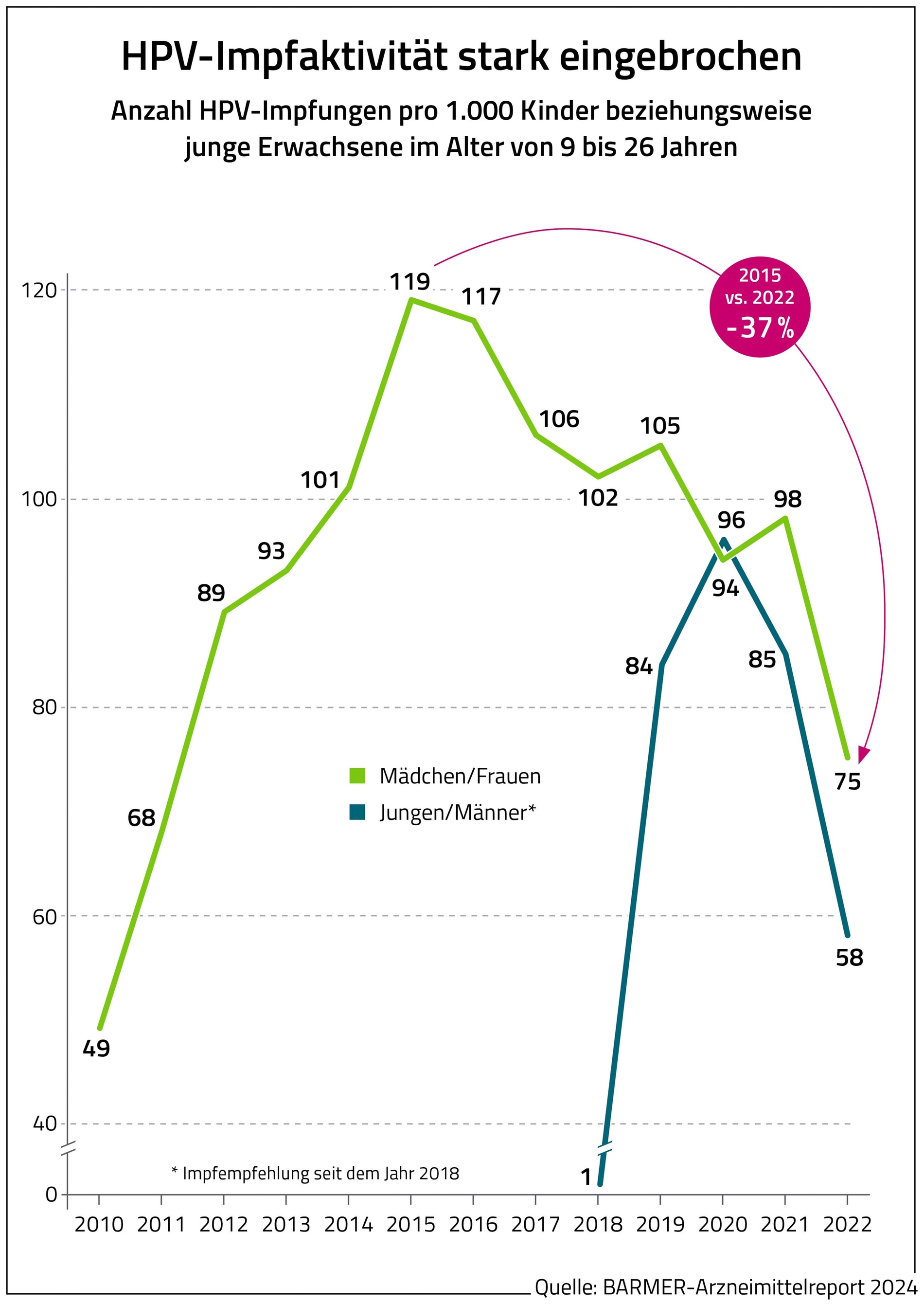 Dem neuen BARMER Arzneimittelreport zufolge ist die Impfrate von 2021 auf 2022 von 98 auf 75 Impfungen je 1.000 Mädchen zurückgegangen (-23,5 Prozent). Im Vergleich zum Rekordjahr 2015 beträgt der Rückgang sogar 37 Prozent. „Das humane Papillomavirus ist für die Hälfte aller virusbedingten bösartigen Tumore und für fast 100 Prozent der Fälle von Gebärmutterhalskrebs verantwortlich. Eine HPV-Impfung kann diese Krebserkrankung verhindern und damit Todesfälle vermeiden. Nicht ohne Grund empfiehlt die Ständige Impfkommission am Robert Koch-Institut die HPV-Impfung bei Mädchen zwischen 9 und 14 Jahren“, sagte Prof. Dr. med. Christoph Straub, Vorstandsvorsitzender der BARMER.