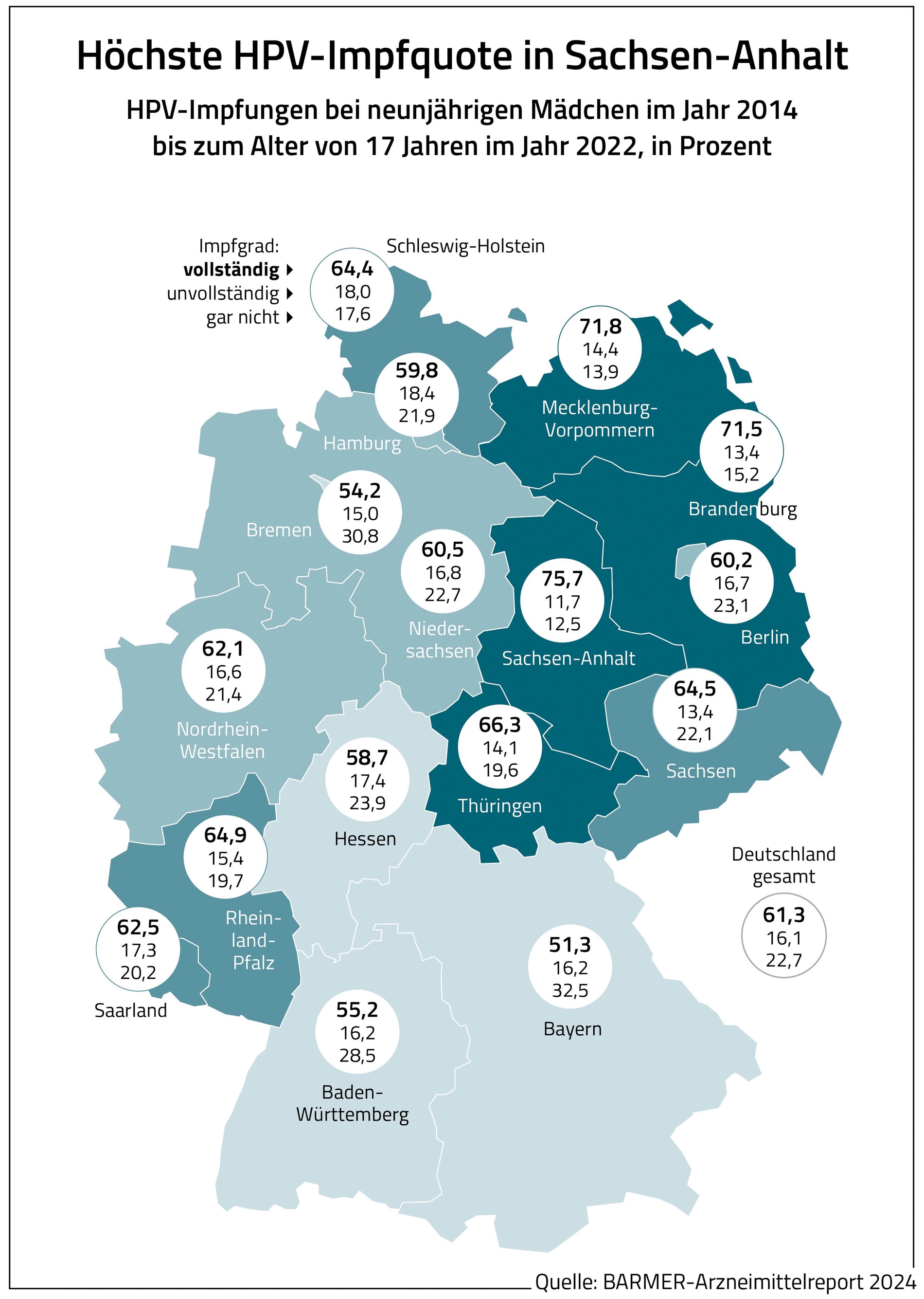 Wie aus dem BARMER-Arzneimittelreport weiter hervorgeht, gibt es bei den HPV-Impfquoten große regionale Unterschiede. In Sachsen-Anhalt sind 75,7 Prozent der 17-jährigen Mädchen vollständig geimpft, gefolgt von Mecklenburg-Vorpommern und Brandenburg mit 71,8 beziehungsweise 71,5 Prozent. Die niedrigsten Quoten gibt es in Bayern, Bremen und Baden-Württemberg mit 51,3 beziehungsweise 54,2 und 55,2 Prozent. Starke regionale Unterschiede gibt es auch bei den Anteilen gegen HPV komplett ungeimpfter Mädchen. Die Spanne reicht hier von 12,5 Prozent in Sachsen-Anhalt bis hin zu 32,5 Prozent in Bayern.