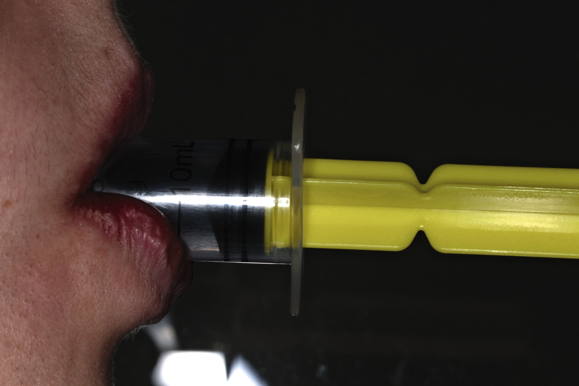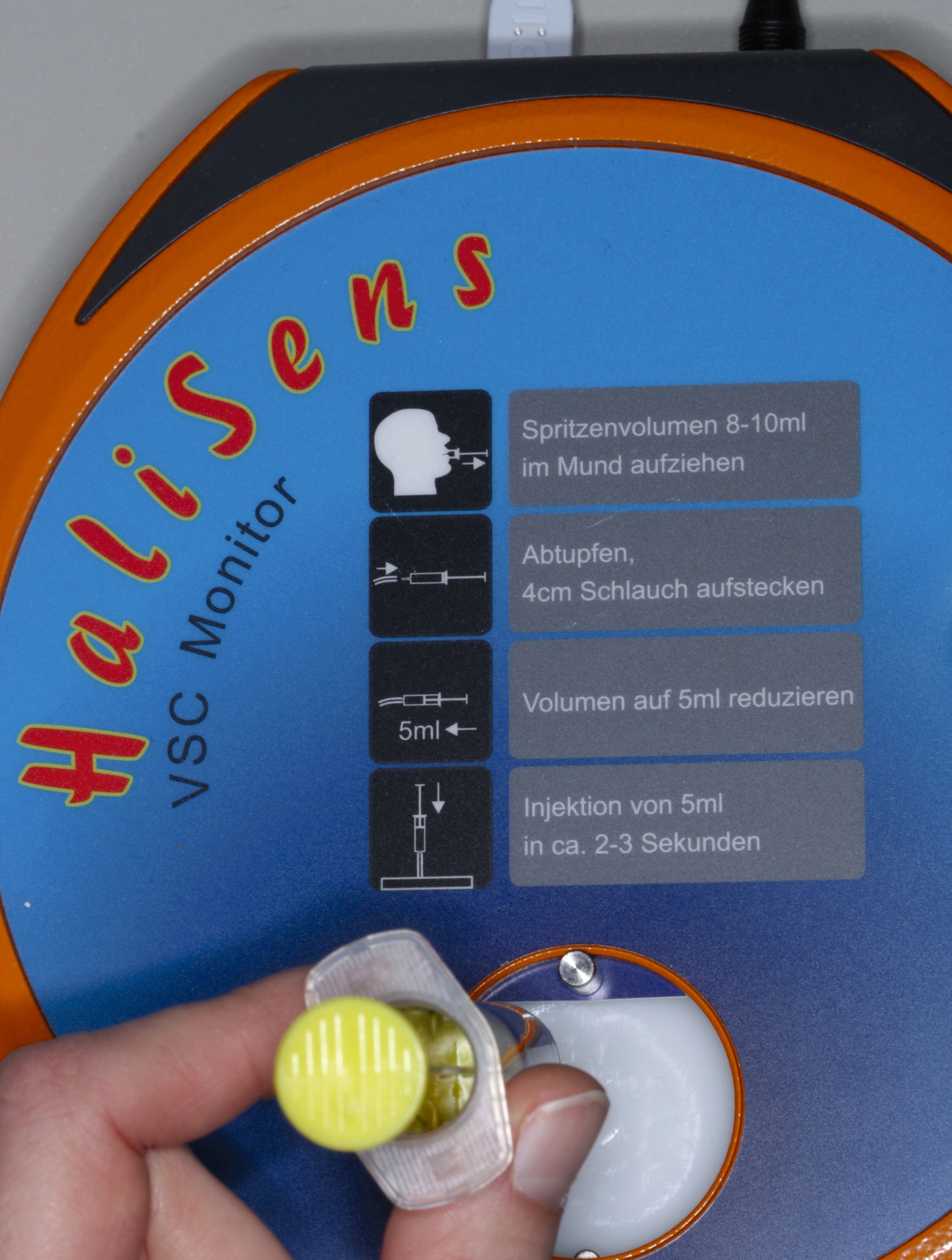 Zusätzlich zur intraoralen Diagnostik und der speziellen Anamnese kann auch Geräte-Diagnostik zur Analyse der Atemluft zum Einsatz kommen. Geräte, wie zum Beispiel ein Gaschromatograf können das objektive Vorhandensein von übelriechenden Schwefelverbindungen feststellen. Dafür wird die Atemluft des Patienten in einer Spritze aufgenommen und in das Gerät gegeben (Abbildungen 2 und 3).