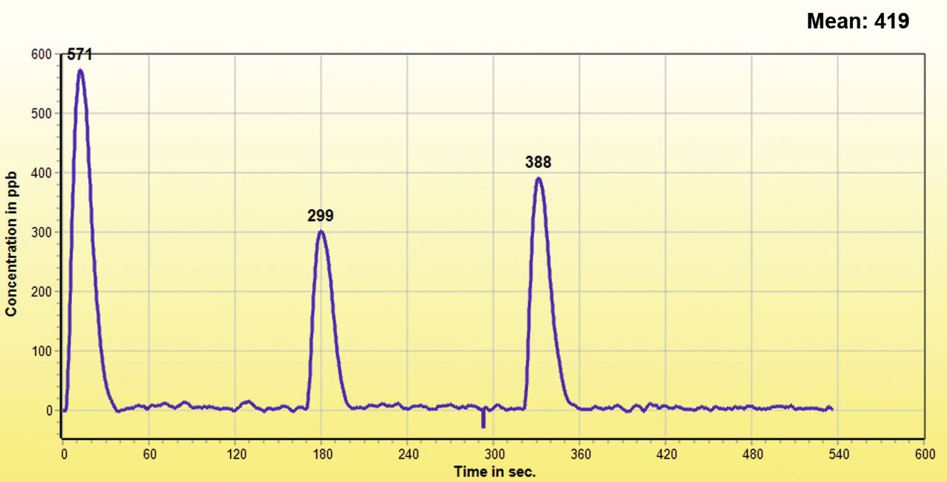Die Messung mittels eines Gaschromatografen (Abbildung 4) kann als Goldstandard angesehen werden [Yaegaki und Coil, 2000]. Damit ist es möglich, die Konzentration an schwefligen Gasen in der Atemluft zu bestimmen und digital zu erfassen (Abbildung 5). Die wichtigsten flüchtigen Schwefelverbindungen sind Schwefelwasserstoff (H₂S), Methylmercaptan (CH4S) und Dimethylsulfid (C2H6S). Diese flüchtigen Schwefelverbindungen, sogenannte „volatile sulphur compounds“ (VSC), werden hauptsächlich von gramnegativen anaeroben Bakterien gebildet [Bollen und Beikler, 2012].