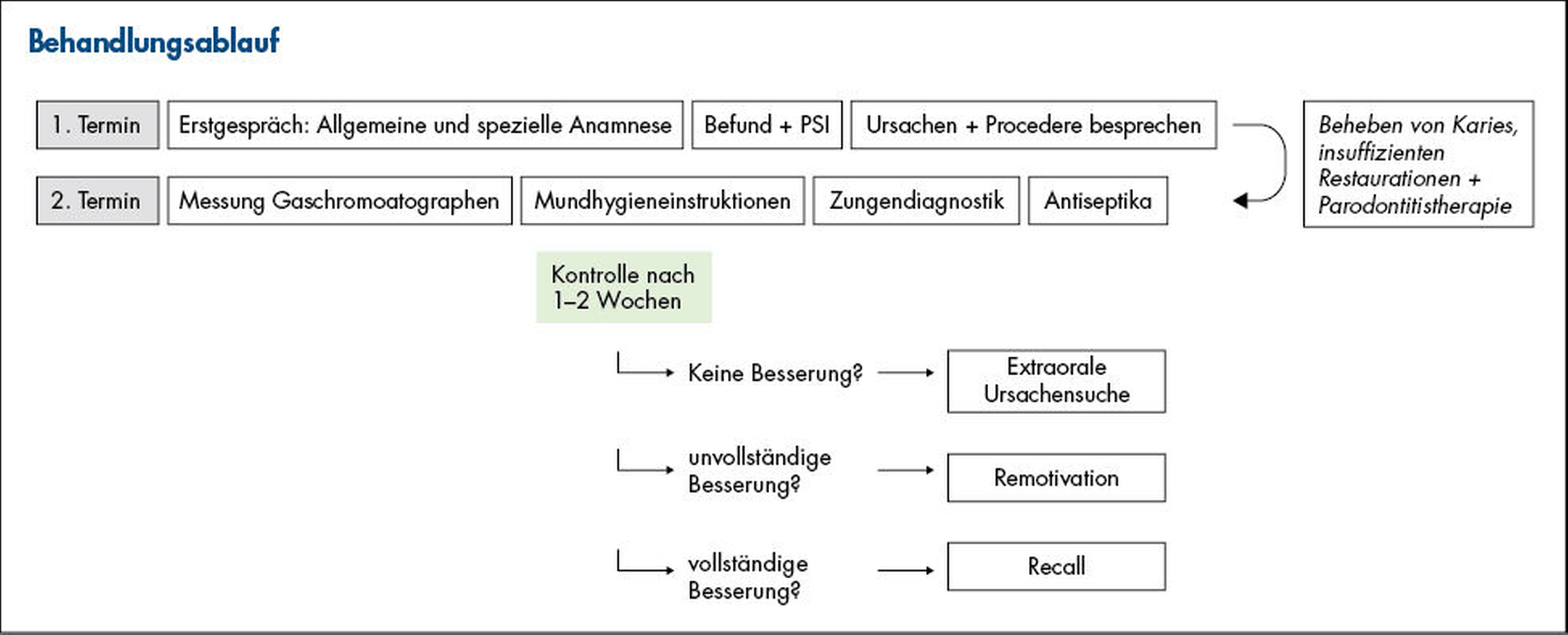 Je nach Befund werden die weiteren Behandlungen festgelegt. In den meisten Fällen zeigt sich die Notwendigkeit einer Parodontitistherapie; gegebenenfalls müssen in diesem Rahmen Restaurationsränder verbessert werden. Mundhygieneinstruktionen mit besonderem Schwerpunkt auf der Reinigung des Zungenrückens erfolgen in jedem Fall.