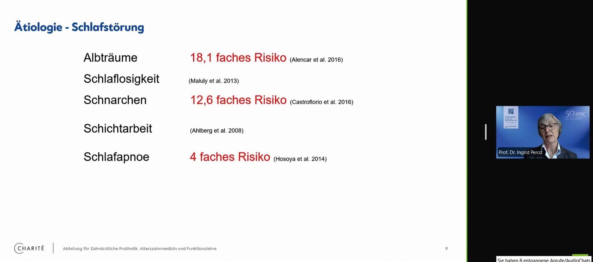 Prof. Dr. Ingrid Peroz (Berlin) gab in ihrem Vortrag „Bruxismus – Was können wir Zahnärzte tun?“ einen Überblick über die Ätiologie und die Diagnostik bis hin zu therapeutischen Maßnahmen. Entgegen der früheren Annahme, dass die Ursache für Bruxismus okklusal bedingt ist, gehe man heute eher von einer zentralnervösen Störung aus, während die Okklusion „allenfalls noch eine Randrolle spielt“. Neben Stress könnten Schlafstörungen, Medikamente (beispielsweise Antidepressiva), Drogen und auch die Genetik einen erheblichen Einfluss haben.