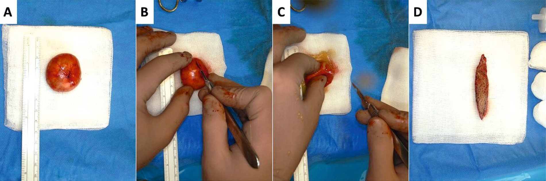 Aufgrund fehlender Risikofaktoren dafür erfolgte anschließend die Resektion des größten nuchalen Befunds – unter der Verdachtsdiagnose eines Atheroms – in Lokalanästhesie. Unter Exzision einer elliptischen Hautspindel (Abbildung 4D) ließ sich dabei eine zystische Raumforderung mit glatter, glänzender Oberfläche in toto (Abbildungen 3A–3C und Abbildung 4A) entfernen. Nach Lamellierung entleerte sich eine trübe, gelbliche Flüssigkeit (Abbildungen 4B und 4C) und die Innenwand präsentierte sich homogen und matt.