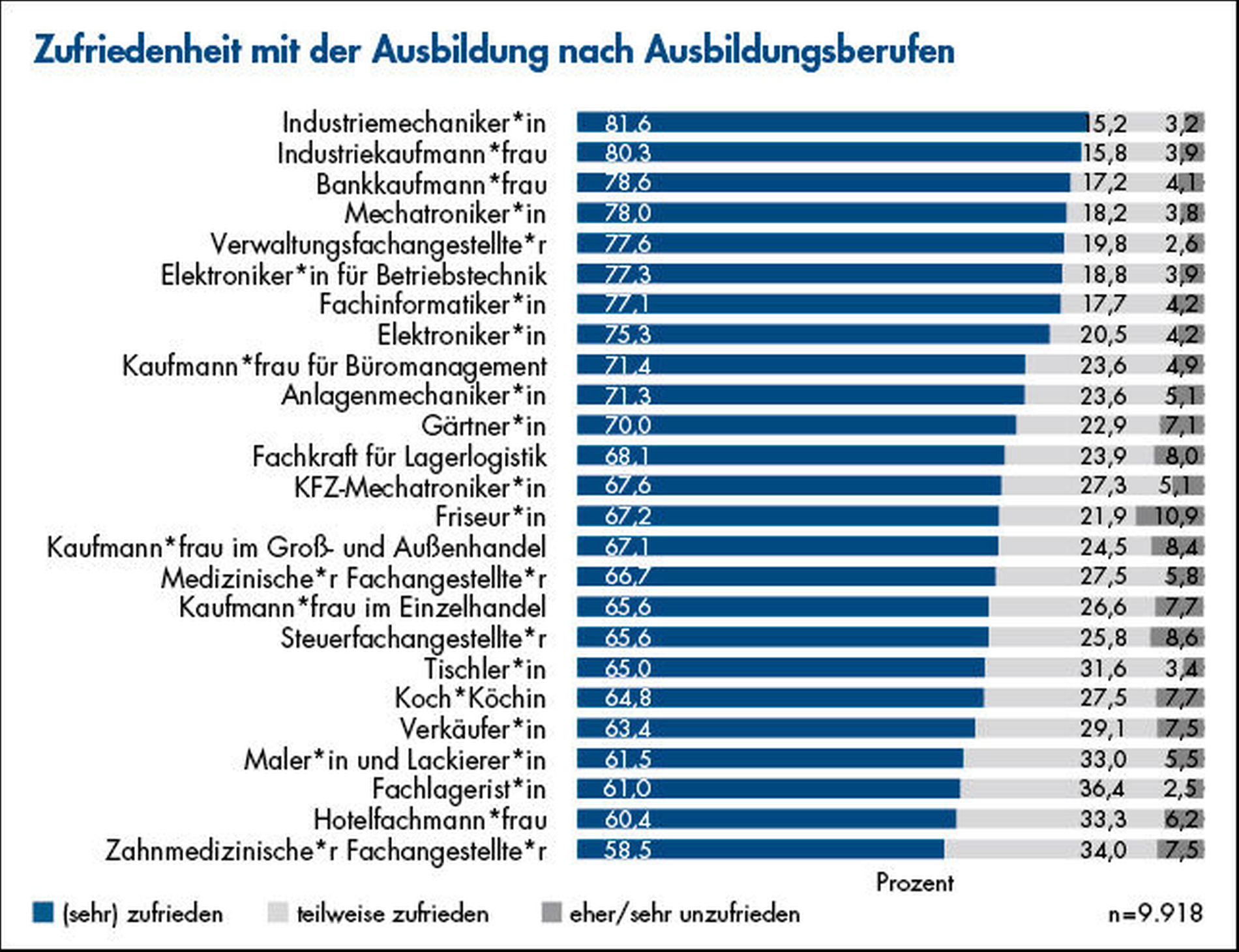 10,9 Prozent gaben an, dass ihre Ausbilder „selten“ oder „nie“ am Ausbildungsplatz verfügbar seien. Zudem gaben 13,8 Prozent an, Arbeitsvorgänge „selten“ oder „nie“ zufriedenstellend erklärt zu bekommen. Dabei sind Auszubildende erheblich zufriedener mit ihrer Ausbildung, wenn sie gut angeleitet werden.