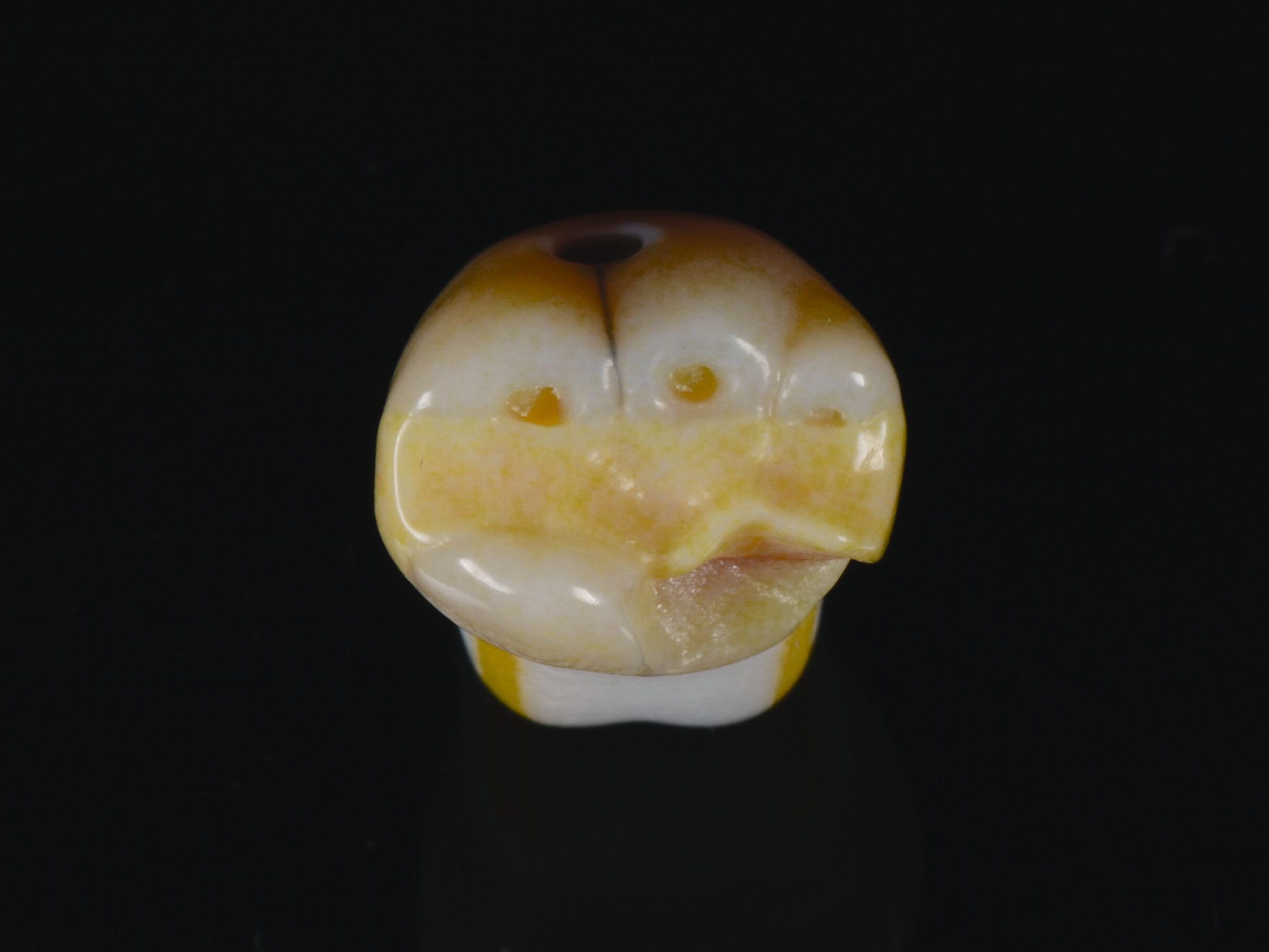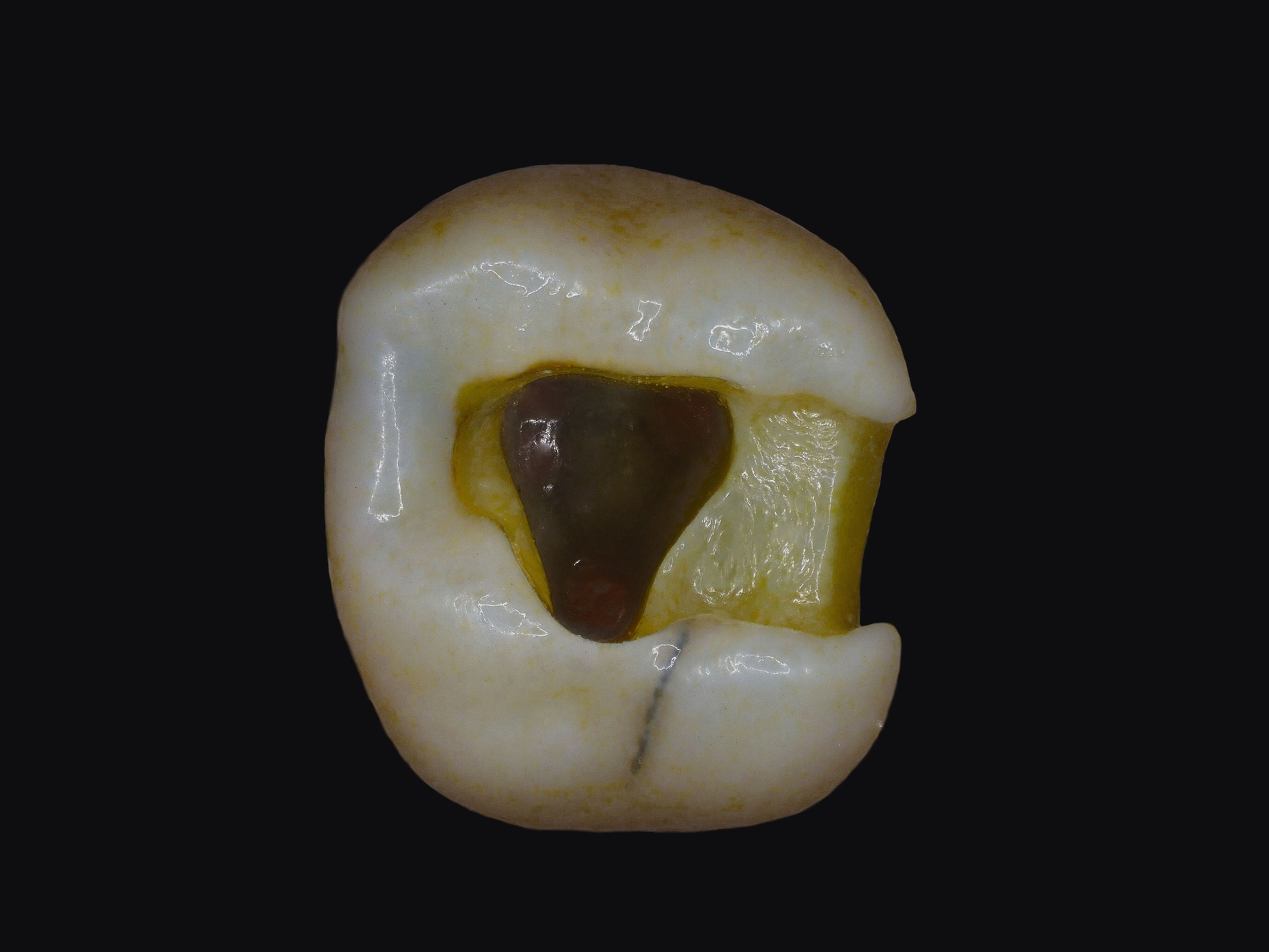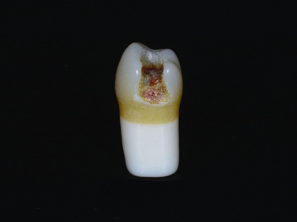 Ebenfalls simuliert werden kann eine rötliche Pulpa, die aufgrund der anatomischen Nähe ein charakteristisches Bild im Dentin bei tiefen Kavitäten erzeugt (Abbildung 6). Die Pulpa selbst besteht aus einem weichen Material und ermöglicht eine partielle Entfernung für die Übung von Pulpotomien.