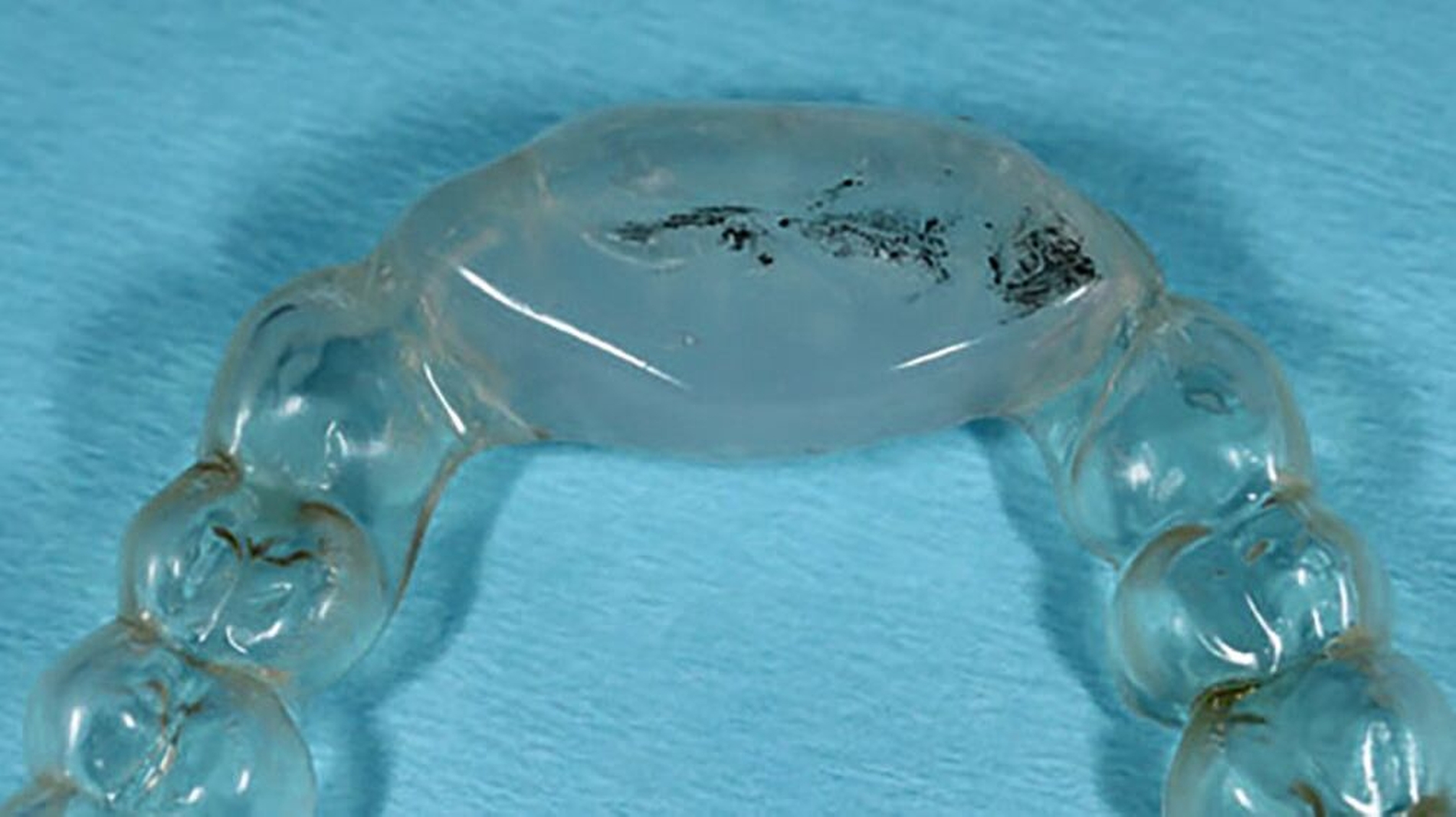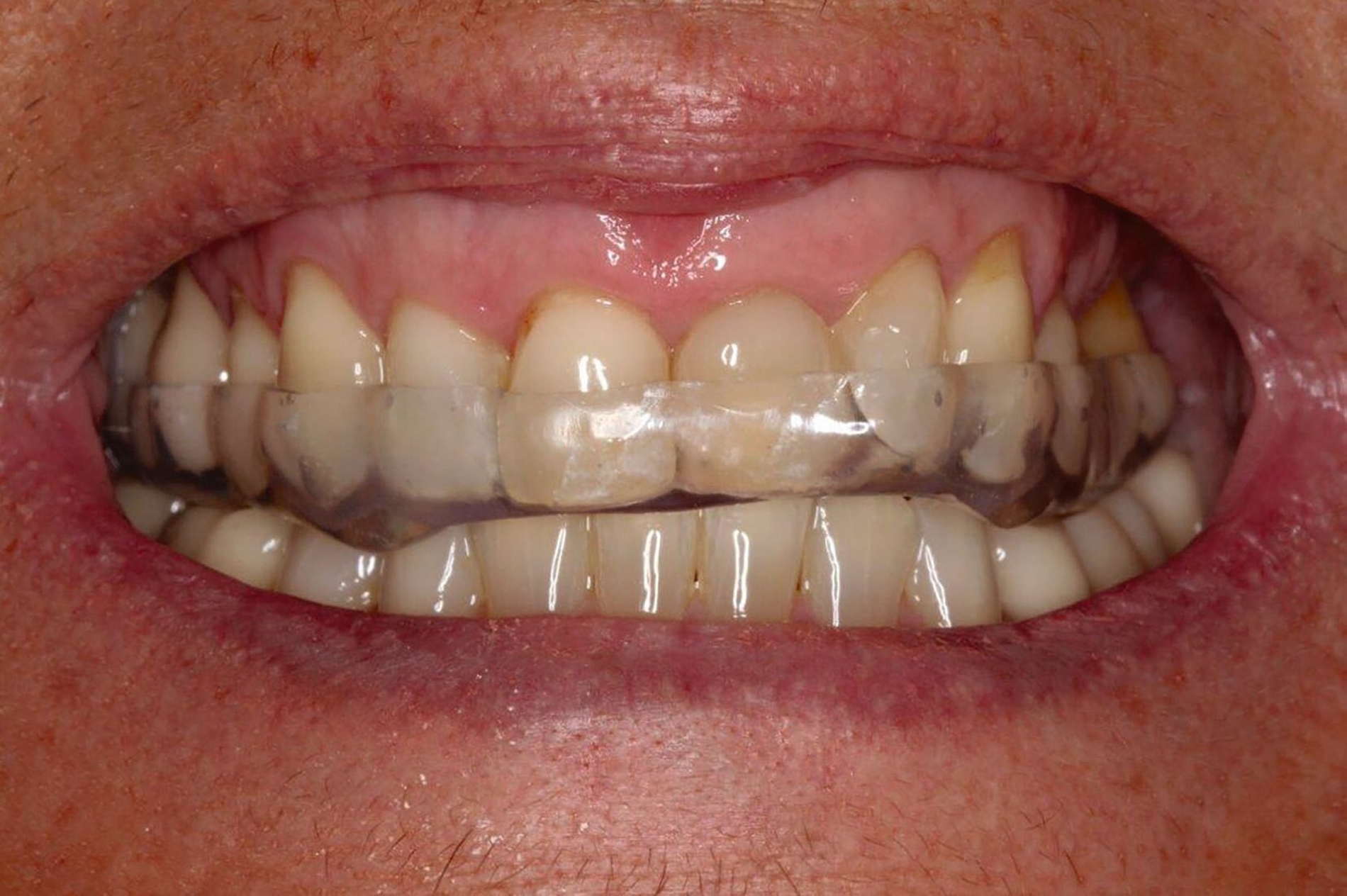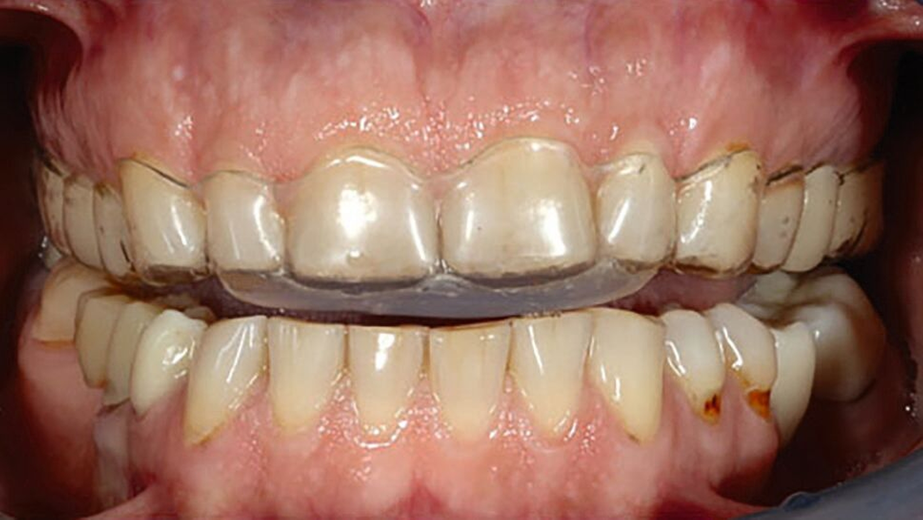 Als Therapiemittel können Relaxierungs- oder Repositionsschienen eingesetzt werden. Eine Sonderform stellt in diesem Kontext der Einsatz von Simulationsschienen dar (Abbildungen 9 bis 11). Diese sind aus zahnfarbenem Material anatomisch gefertigt und werden ganztags getragen [Güth et al., 2022]. Je nach Güte der Retention an den Zähnen können Betroffene hiermit auch essen.