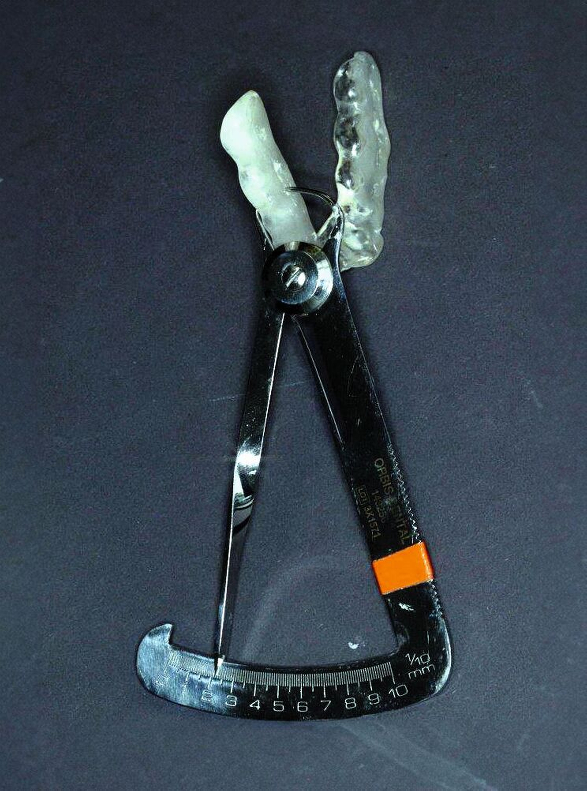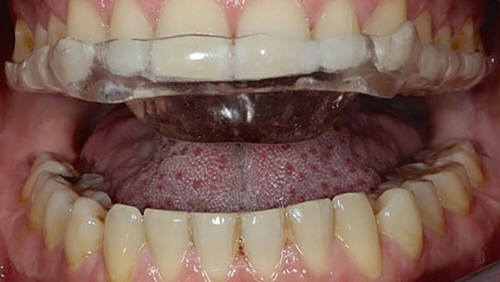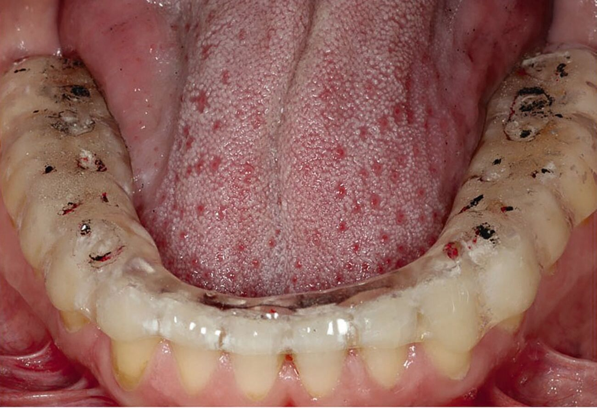 Als Therapiemittel können Relaxierungs- oder Repositionsschienen eingesetzt werden. Eine Sonderform stellt in diesem Kontext der Einsatz von Simulationsschienen dar (Abbildungen 9 bis 11). Diese sind aus zahnfarbenem Material anatomisch gefertigt und werden ganztags getragen [Güth et al., 2022]. Je nach Güte der Retention an den Zähnen können Betroffene hiermit auch essen.