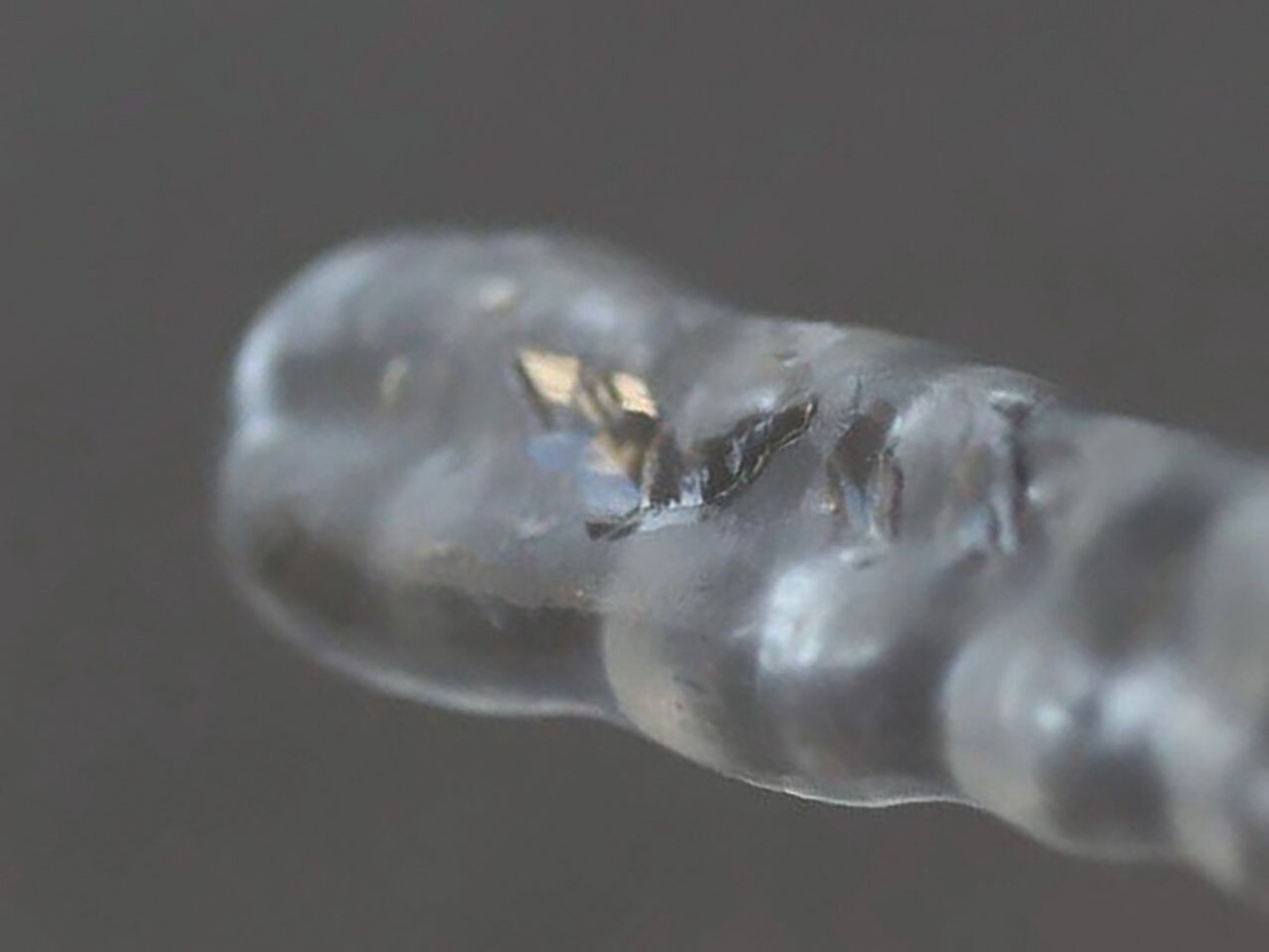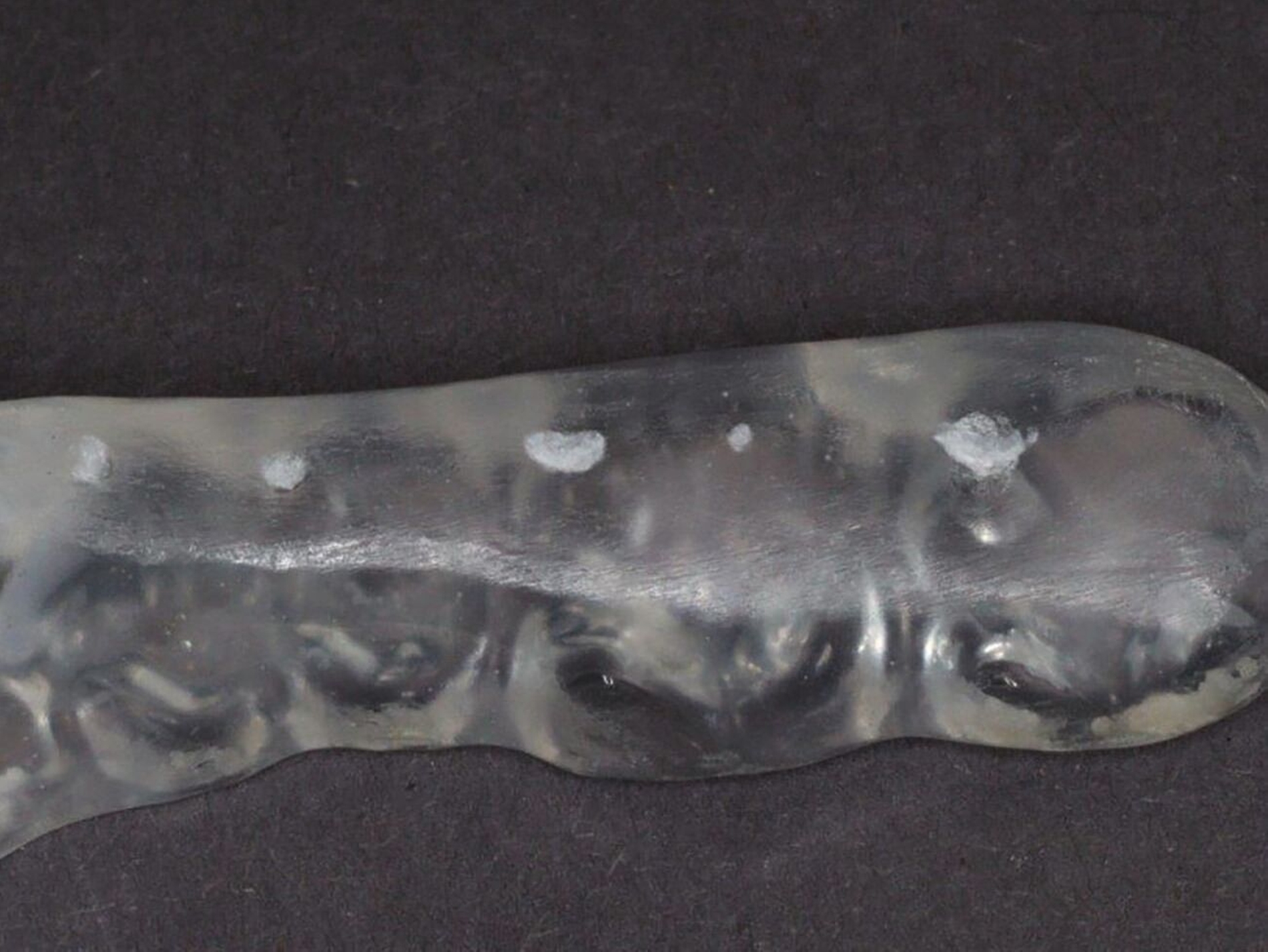 OS werden inspiziert in Bezug auf Art und Intensität der Nutzungsspuren. Linienförmige Spuren deuten auf ein Knirschen (Abbildung 7), weißlich-milchig-punktförmige auf ein Pressen hin (Abbildung 8). Im Rahmen der aktiven Therapiephase hat es sich bewährt, diese Spuren regelmäßig auszupolieren um zu erfassen, welche Parafunktion nachfolgend während des Schiene-Tragens ausgeführt wird. Sobald auf einer Reflexschiene Zeichen für Knirschen beobachtet werden, empfiehlt es sich, das Therapiemittel zu wechseln. Ein Pressen auf einer Relaxierungsschiene sollte in Bezug auf Beschwerdebild und Befund bewertet werden.
