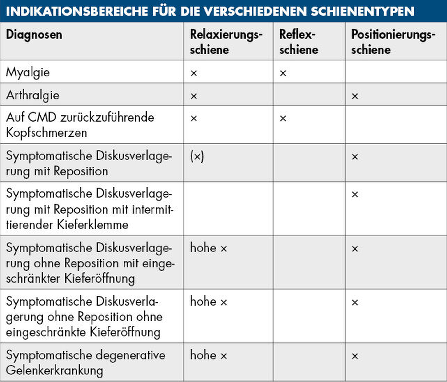 Zur Behandlung von Schmerzen und Beschwerden im Rahmen einer CMD können folgende Schienentypen eingesetzt werden: Relaxierungsschienen, Reflexschienen und Positionierungsschienen (Tabelle 1).