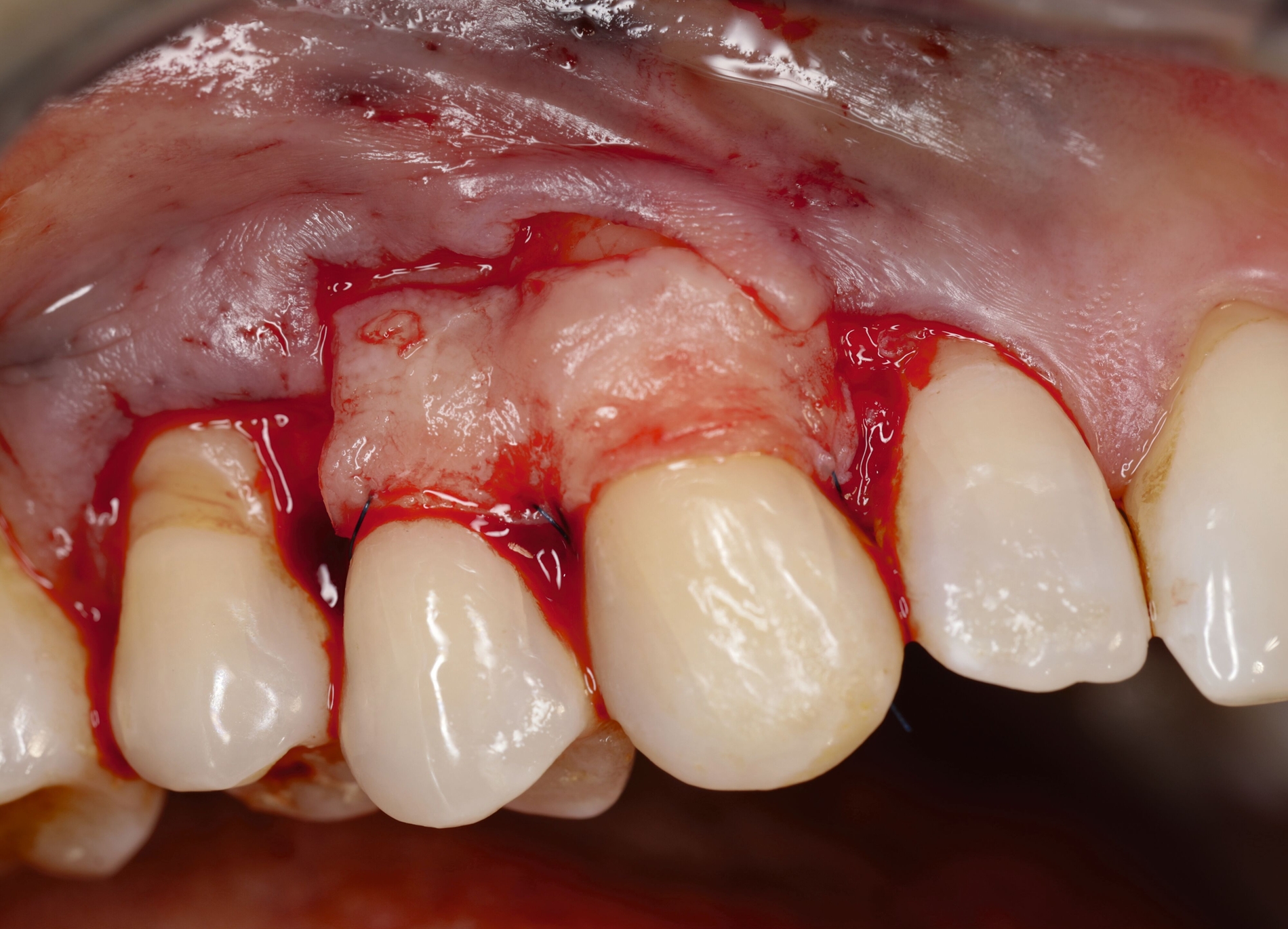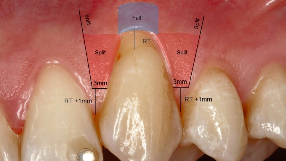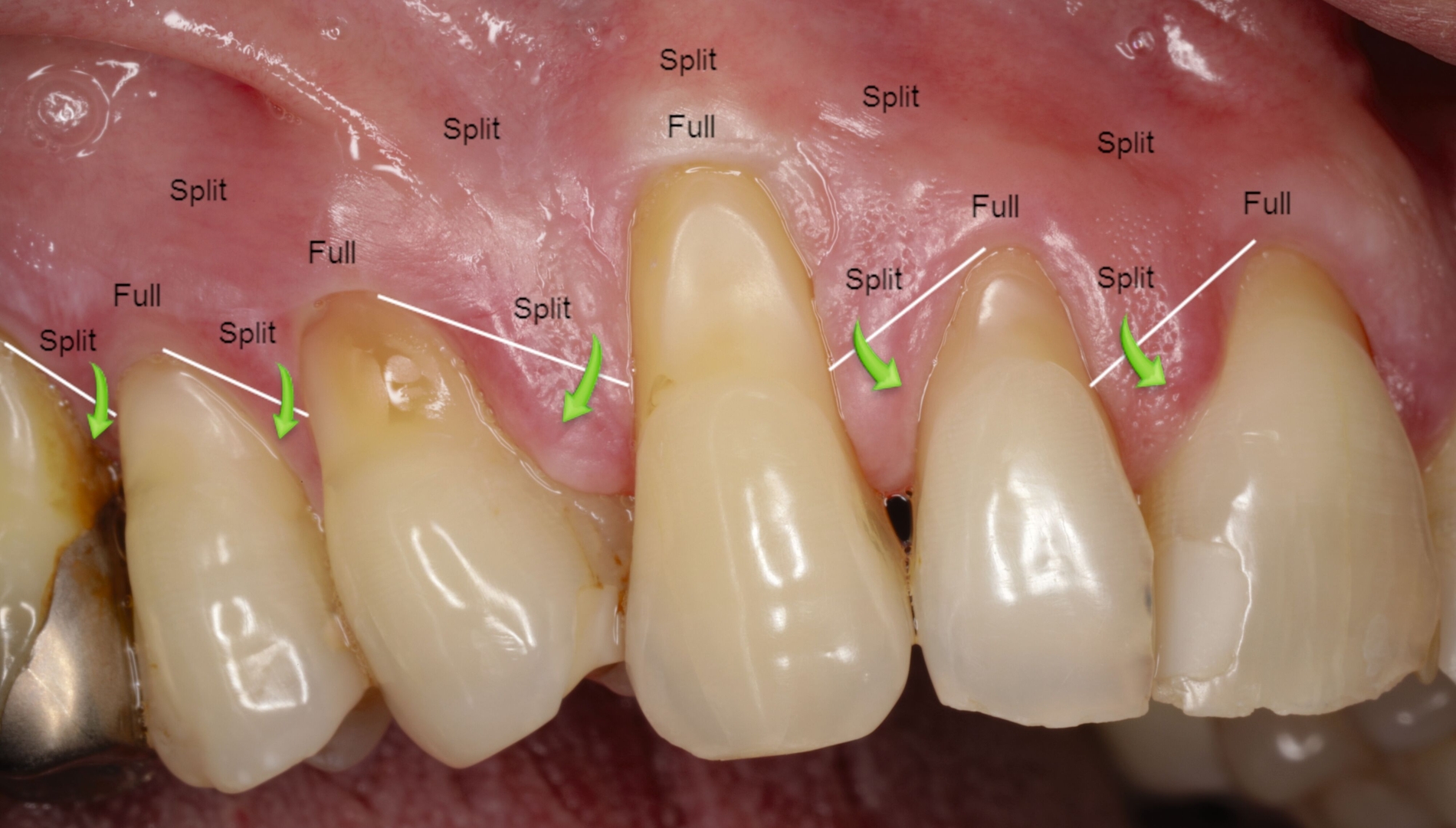 Der daraus resultierende trapezförmige Lappen wird anschließend als kombinierter Split-Full-Split-Lappen von koronal nach apikal präpariert. Dabei erfolgt zunächst die Präparation der markierten chirurgischen Papillen als Spaltlappen. Anschließend wird das Weichgewebe apikal der Rezession mit einem Raspatorium bis circa 3–4 mm über die bukkale knöcherne Dehiszenz als Volllappen präpariert. Dadurch wird sichergestellt, dass in diesem Anteil des Lappens, der für die Abdeckung der exponierten Wurzeloberfläche verwendet wird, eine ausreichende Gewebedicke inklusive Periosteum verbleibt. Um eine spannungsfreie Mobilisation des Lappens nach koronal zu ermöglichen, wird der apikale Anteil des Lappens als Spaltlappen präpariert, zusätzlich werden alle Muskelinsertionen eliminiert. Es folgt eine Entepithelisierung der anatomischen Papillen koronal der horizontalen Inzisionen, um so eine bindegewebige Auflagefläche zu schaffen, auf der die chirurgischen Papillen abschließend fixiert werden. Der Nahtverschluss setzt sich zusammen aus einer einfachen Umschlingungsnaht im Bereich der interdentalen Papillen und Einzelknopfnähten im Bereich der vertikalen Inzisionen.