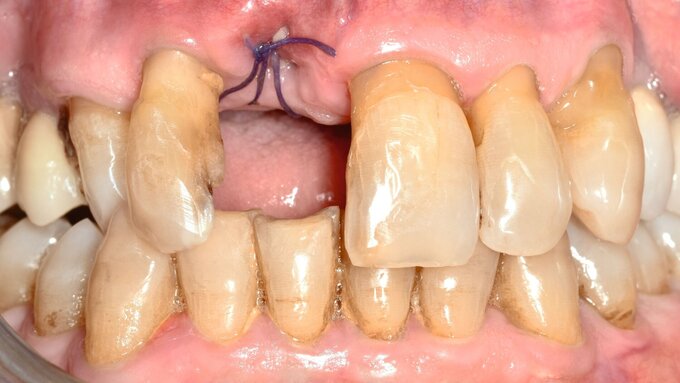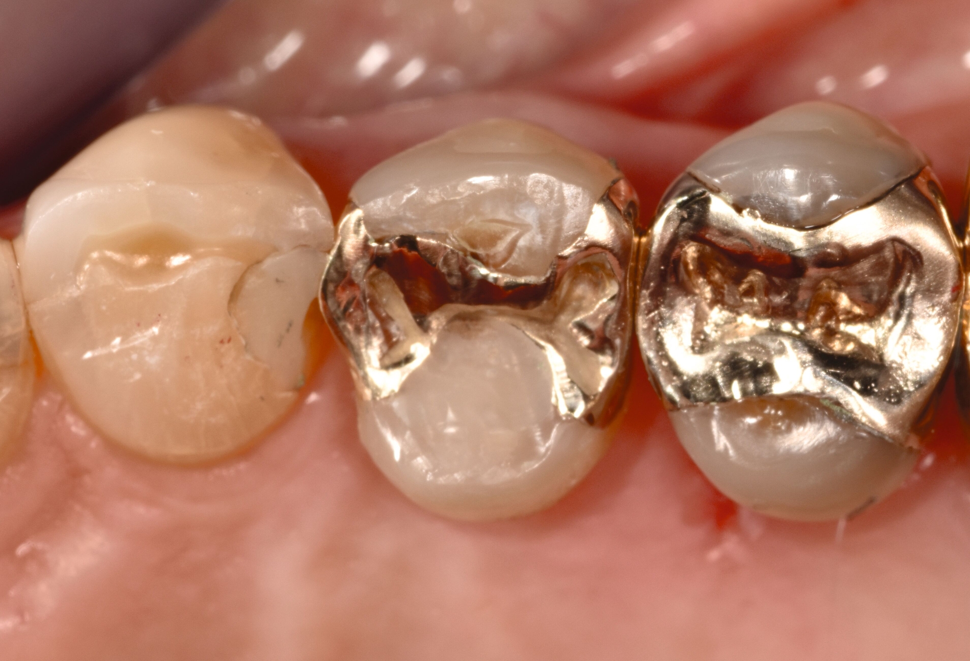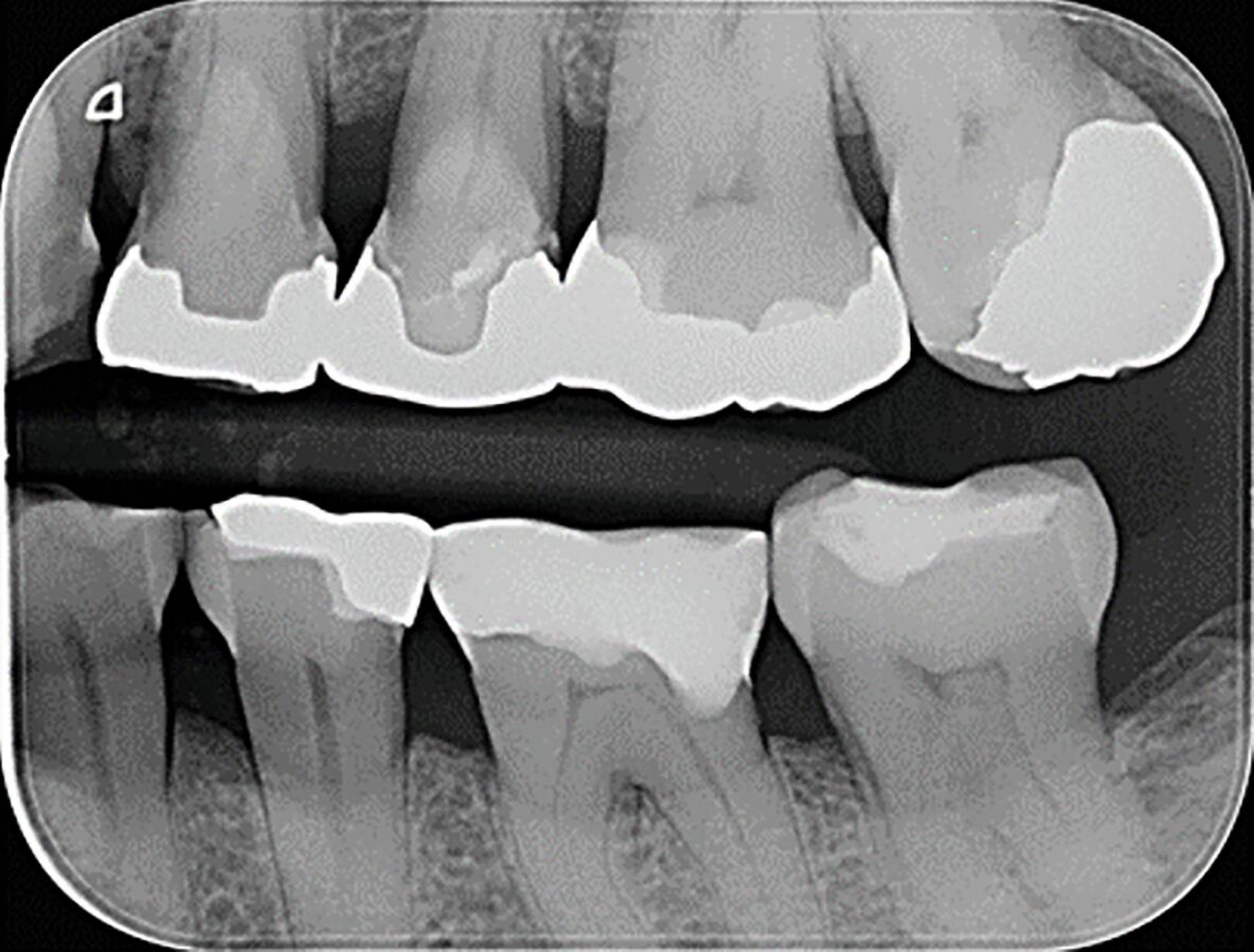 Aufgrund einer erwartungsgemäß erschwerten fotografischen Dokumentation bei der zahnärztlichen Behandlung in der mobilen Zahnmedizin wird die klinische Falldokumentation an einer Seniorin vorgenommen, deren Therapiefähigkeit und Eigenverantwortlichkeit nicht eingeschränkt war. Die 76-jährige Patientin stellt sich zur routinemäßigen Kontrolle in der Poliklinik für Zahnerhaltungskunde vor. Die allgemeine Anamnese ergab Zustand nach Meningeom, eine Quecksilber- und eine Birkenpollenallergie und einen erhöhten Blutdruck, der mit Lercanidipin eingestellt war. Am circa 20 Jahre alten Gussmetall-Inlay an Zahn 24 wurde dabei ein sondierbarer Randspalt festgestellt (Abbildungen 2a und 2b).