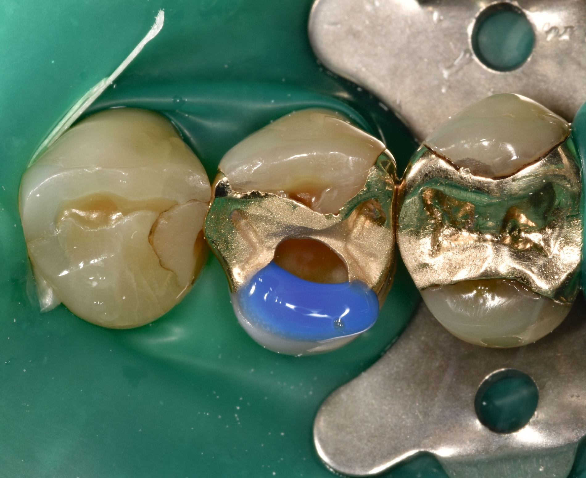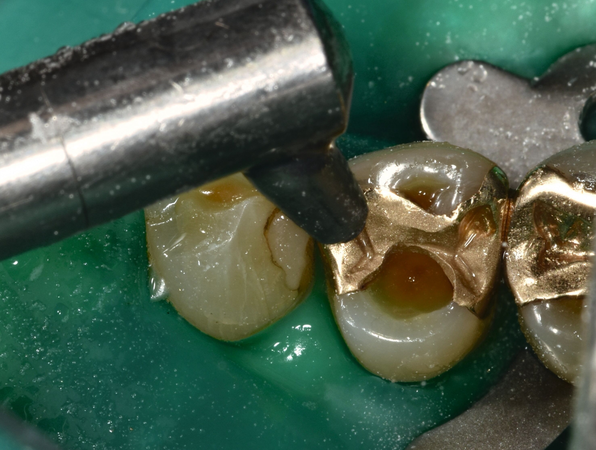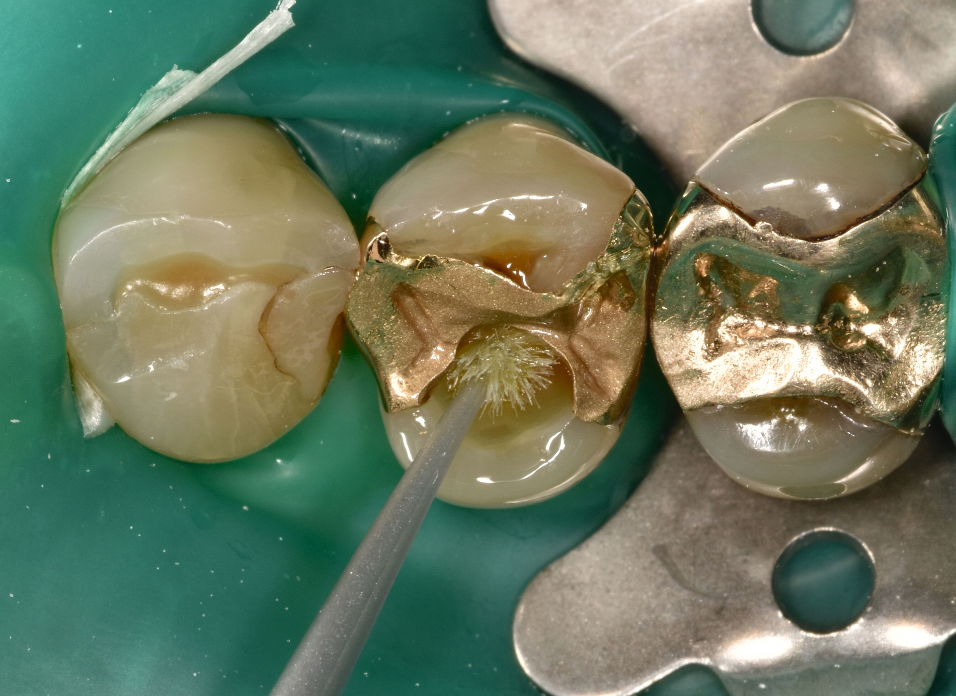 Nach Reinigung der Zähne und Bestimmung der Zahnfarbe wurde Kofferdam zur absoluten Trockenlegung angelegt. Mit rotierenden Instrumenten wurde ein Teil des Gussmetall-Inlays im sondierbaren Bereich entfernt und die Karies exkaviert (Abbildungen 2c und 2d). Anschließend wurden alle zu reparierenden Oberflächen (Gussmetall, Dentin und Schmelz) mit reinem Aluminiumoxid, Partikelgröße 50 µm (Rondoflex®/KaVo), unter Verwendung von Wasser abgestrahlt und danach gründlich mit Wasser abgespült (Abbildungen 2e und 2f). Die selektive Schmelzätzung erfolgte mit 37,5-prozentiger Phosphorsäure (Email Preparator®/Ultradent) für 30 Sekunden (Abbildung 2g). Nach Abspülen der Phosphorsäure mit Wasser wurde ein Universaladhäsiv (Clearfil Universal Bond Quick® / Kuraray Noritake) aufgetragen (Abbildung 2h, Glanz soll erhalten bleiben, Verdunstung einige Sekunden abwarten) und dann lichtpolymerisiert.