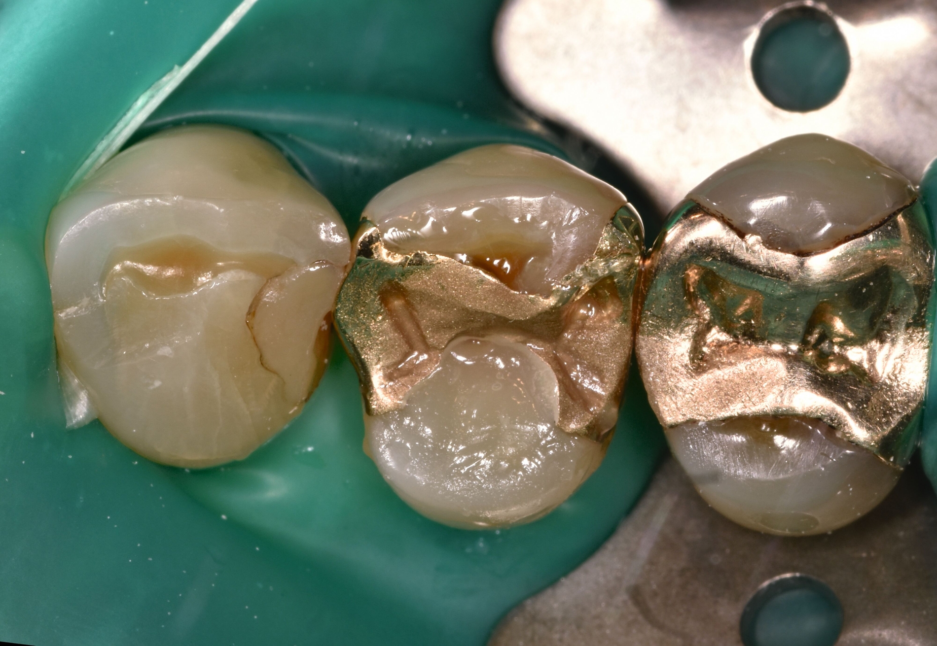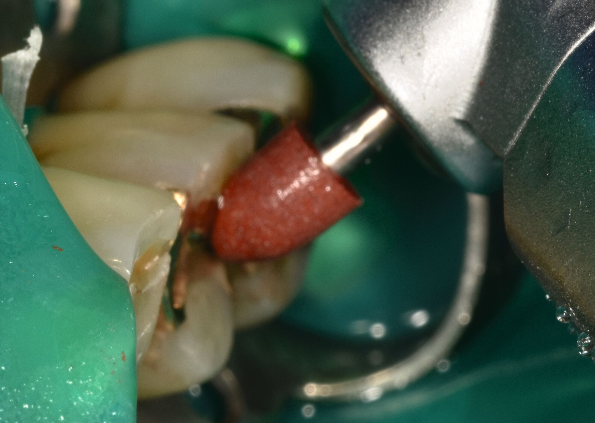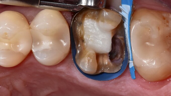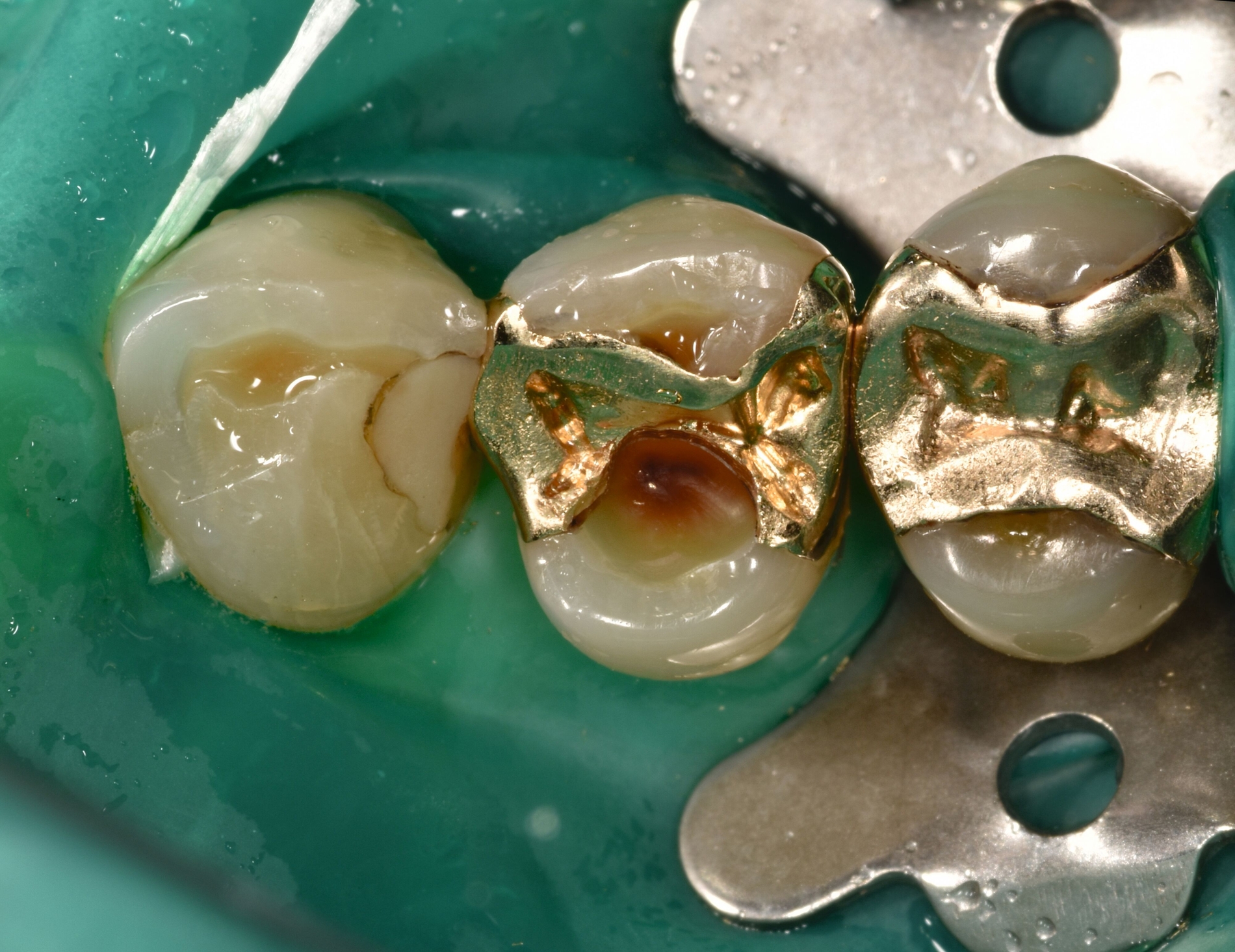 Nach Reinigung der Zähne und Bestimmung der Zahnfarbe wurde Kofferdam zur absoluten Trockenlegung angelegt. Mit rotierenden Instrumenten wurde ein Teil des Gussmetall-Inlays im sondierbaren Bereich entfernt und die Karies exkaviert (Abbildungen 2c und 2d). Anschließend wurden alle zu reparierenden Oberflächen (Gussmetall, Dentin und Schmelz) mit reinem Aluminiumoxid, Partikelgröße 50 µm (Rondoflex®/KaVo), unter Verwendung von Wasser abgestrahlt und danach gründlich mit Wasser abgespült (Abbildungen 2e und 2f). Die selektive Schmelzätzung erfolgte mit 37,5-prozentiger Phosphorsäure (Email Preparator®/Ultradent) für 30 Sekunden (Abbildung 2g). Nach Abspülen der Phosphorsäure mit Wasser wurde ein Universaladhäsiv (Clearfil Universal Bond Quick® / Kuraray Noritake) aufgetragen (Abbildung 2h, Glanz soll erhalten bleiben, Verdunstung einige Sekunden abwarten) und dann lichtpolymerisiert.