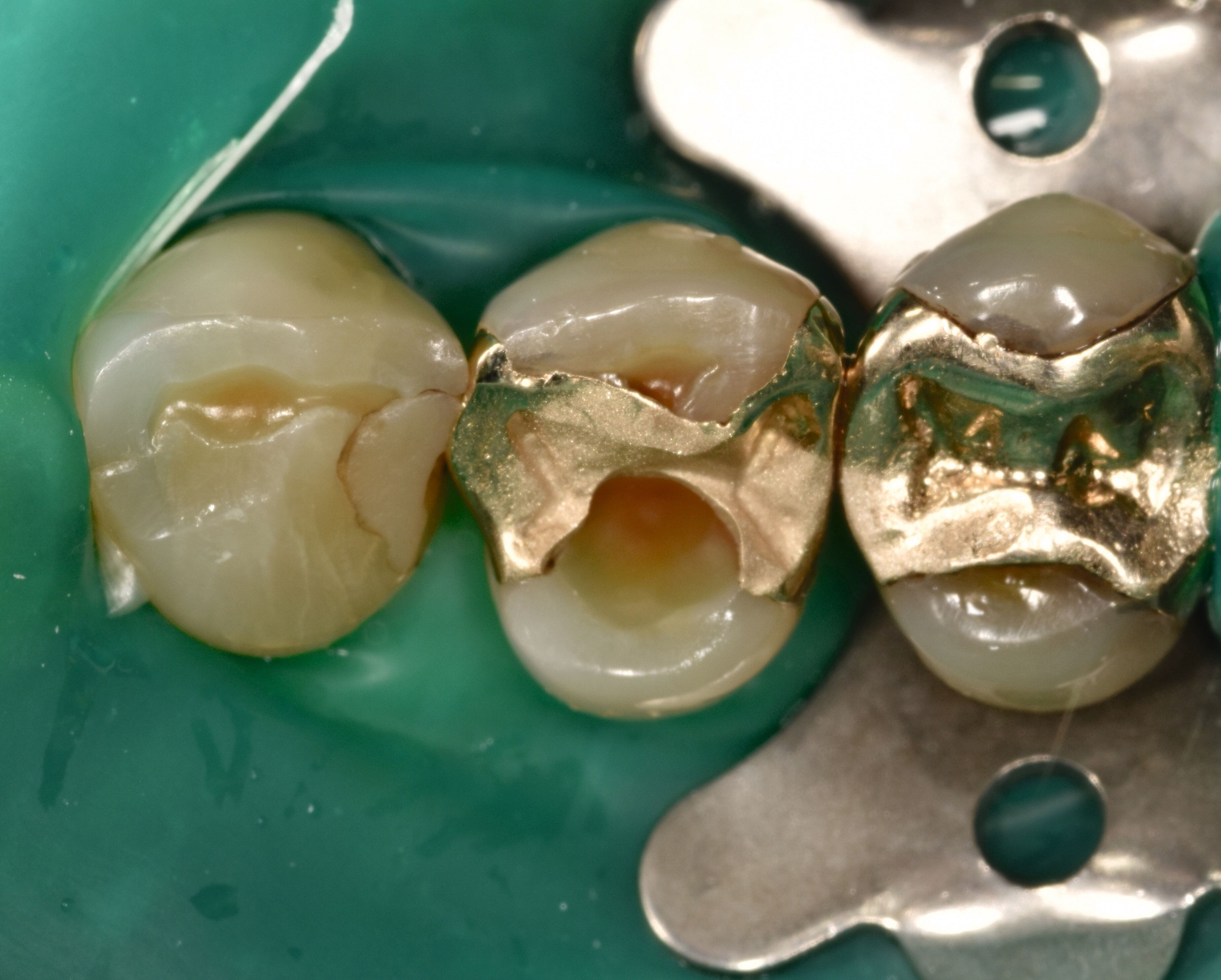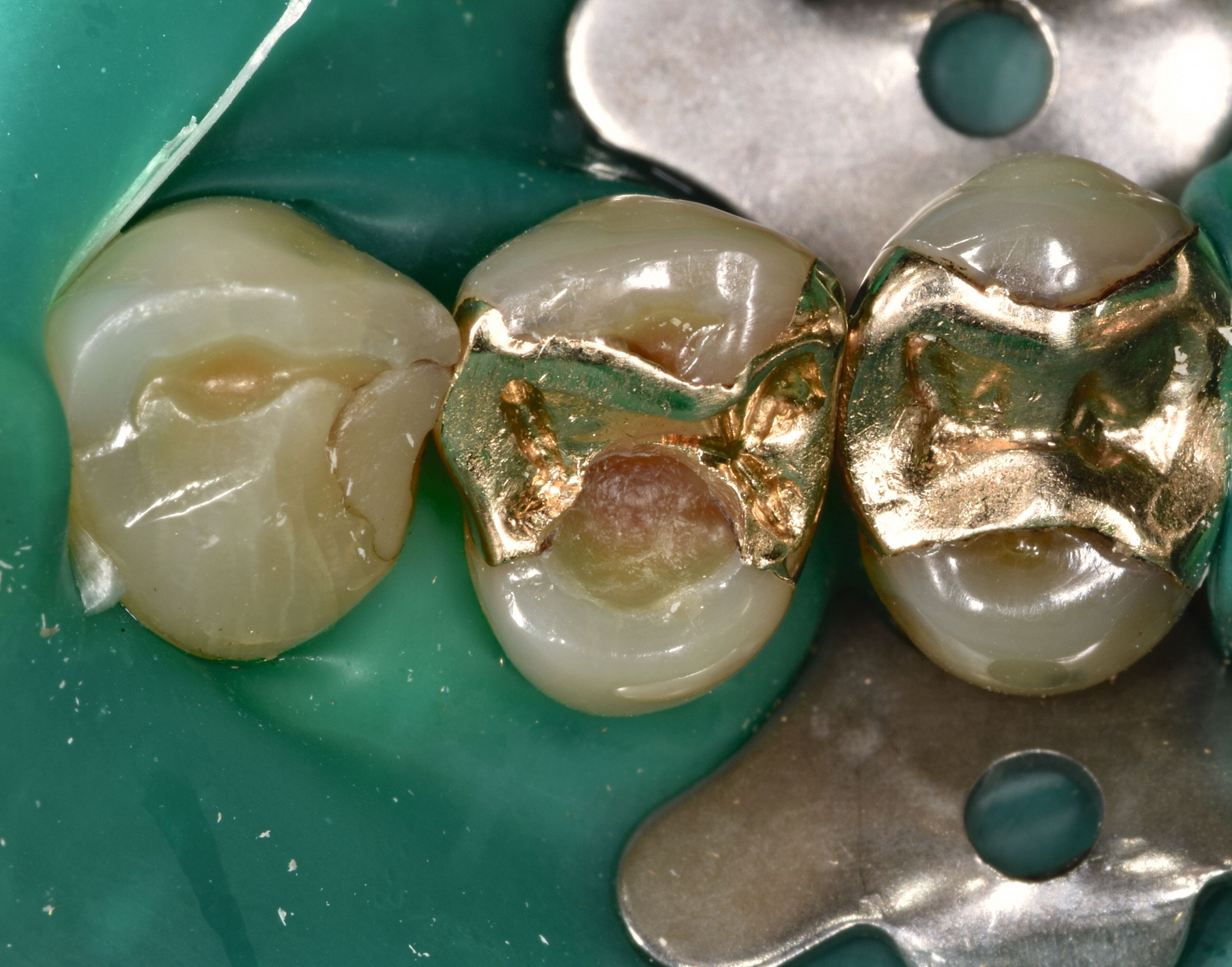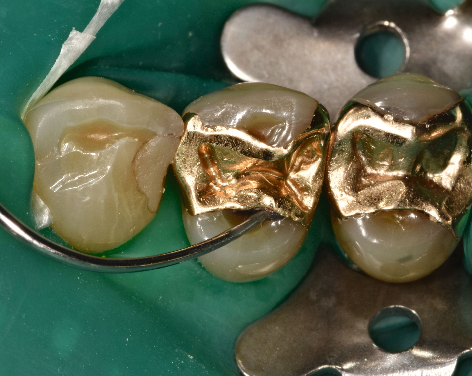 Im Anschluss wurde die Reparaturrestauration mit Komposit (Ceram X Spectra®/Dentsply Sirona) eingebracht (Abbildung 2i). Im Sinne des Restaurationsunterhalts wurden bei der Politur die Restaurationsränder der Gussmetall-Inlays an den Zähnen 24 und 25 finiert und zusammen mit der Kompositrestauration hochglanzpoliert (Abbildungen 2j und 2k).