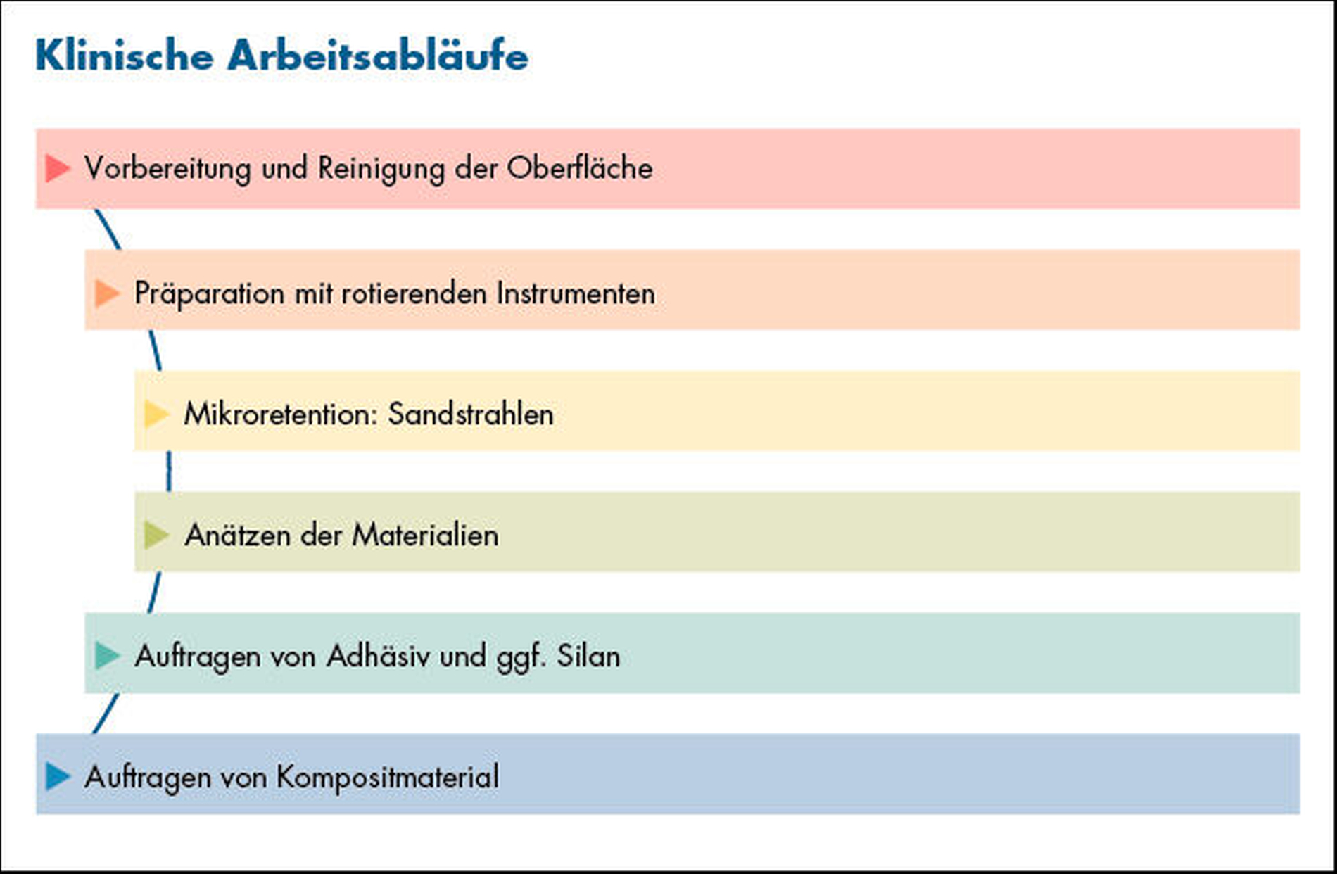 Bei der Adhäsivtechnik in der mobilen Zahnmedizin kann es sinnvoll sein, das Total-etching aufgrund des zusätzlich reinigenden Effekts der Phosphorsäure auf zahlreichen Werkstoffoberflächen zu bevorzugen. Hauptgrund hierfür ist, dass eine adäquate Trockenlegung in der Regel nur erschwert erfolgen kann und mit Kontaminationen durch Speichel und Blut im Behandlungsvorgang gerechnet werden muss. Als mögliche Materialien für eine intraorale Reparatur werden modifizierte Glasionomerzemente, Komposite, Bulk-Fill-Komposite, Flow Komposite (bei Klasse V) sowie dualhärtende Komposite genutzt. Für die dualhärtenden Komposite ist allerdings darauf hinzuweisen, dass herstellerabhängig überprüft werden sollte, ob diese mit einem self-etch-Adhäsiv kombinierbar sind. Gegebenenfalls sollte bei dualhärtenden Kompositen das jeweilige vom Hersteller empfohlene Adhäsivsystem verwendet werden, um Einbußen in der Haftkraft zu vermeiden.