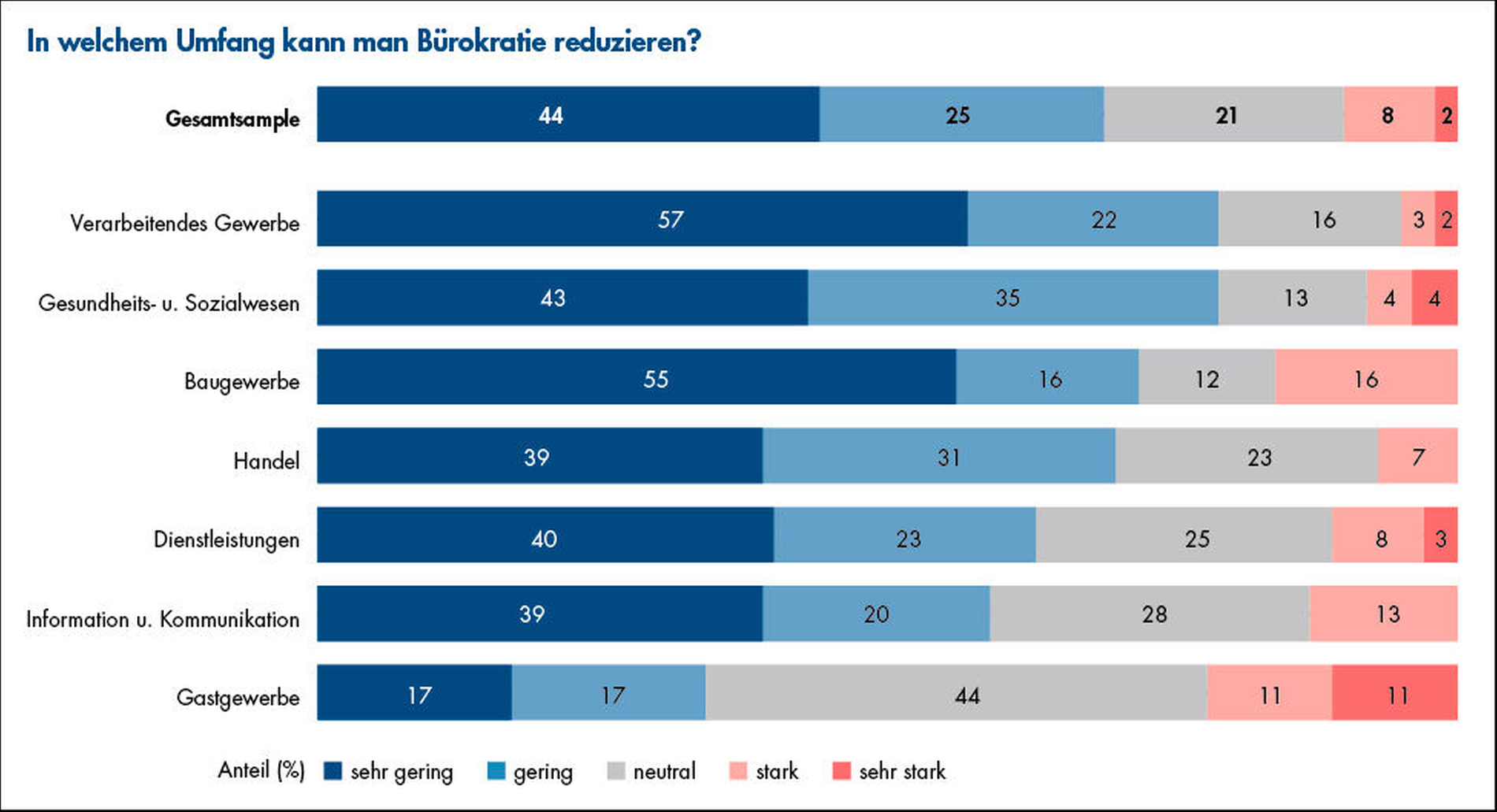 Obwohl das Gesetz zum Ziel hat, die Bürokratiekosten um fast eine Milliarde Euro pro Jahr zu senken, rechnen nur zehn Prozent der befragten Unternehmen mit einer deutlichen Reduzierung ihres bürokratischen Aufwands. Besonders wenig verspricht man sich davon im Verarbeitenden Gewerbe, im Gesundheitswesen, im Baugewerbe und im Handel.