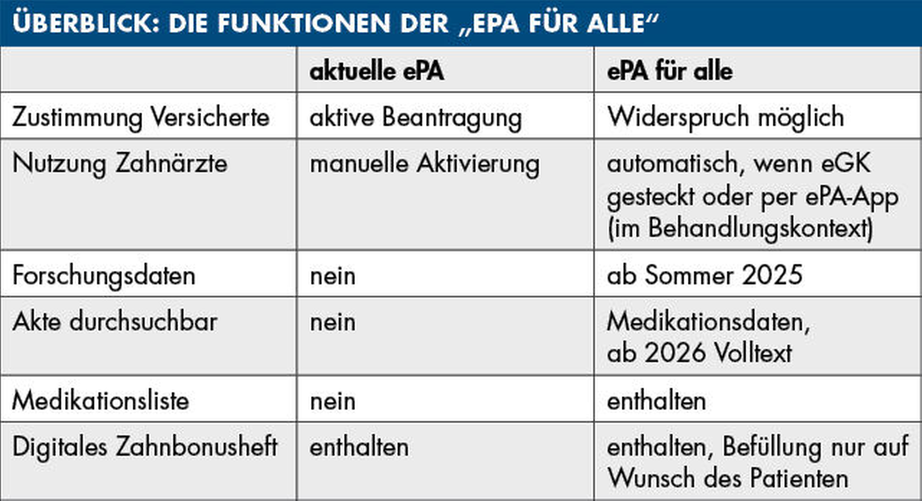 Die neue „ePA für alle“ soll ab Mitte Januar wichtige Gesundheitsdaten – wie Daten zu Befunden, Diagnosen und Therapiemaßnahmen – enthalten sowie strukturierte Informationsobjekte – etwa die elektronische Medikationsliste und das eZahnbonusheft. Die Daten sollen von Zahnärztinnen und Zahnärzten und anderen Gesundheitsberufen eingestellt und eingesehen werden können, wobei das eZahnbonusheft nicht zu den Pflichtanwendungen gehört. Laut einem Schreiben des Bundesgesundheitsministeriums (BMG) an den Bundesverband Gesundheits-IT (bvitg) kurz vor Redaktionsschluss soll der flächendeckende und verpflichtende Rollout nicht bereits nach einer vierwöchigen Testphase, sondern erst nach positiven Erfahrungen in den Testregionen erfolgen.