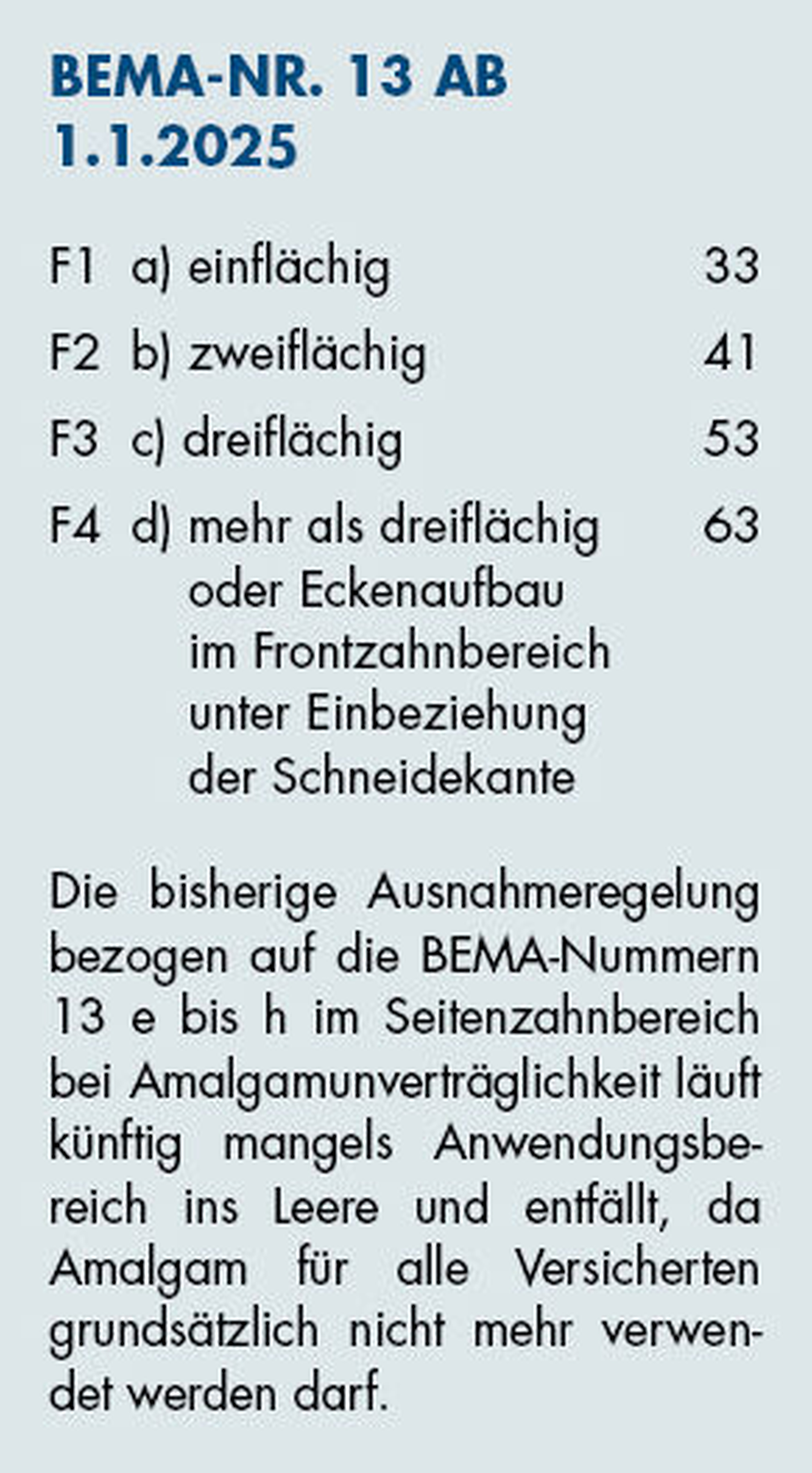 Der Beschluss des Bewertungsausschusses zur Änderung der Gebührenposition 13 des BEMA sieht vor, dass weiterhin plastische Füllungsmaterialien, die ausreichend, zweckmäßig, erprobt und praxisüblich sind, Gegenstand der vertragszahnärztlichen Versorgung sind.