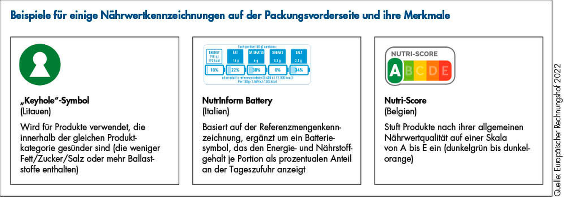 Einige, in der EU eingesetzte Systeme zur Nährwertkennzeichnung werden vom Rechnungshof genau untersucht: das „Healthy Living“-Symbol in Kroatien, das Herzsymbol in Finnland, das „Keyhole“-Symbol in Dänemark, Litauen und Schweden, die „NutrInform Battery“ in Italien, der „Nutri-Score“ in Belgien, Frankreich Deutschland, Luxemburg und den Niederlanden und das „ProtectiveFood“-Symbol in Slowenien (Abbildung 1). Keines der Systeme habe sich durchgesetzt, resümiert der Bericht. Er mahnt an, dass standardisierte Vorschriften den Verbrauchern jedoch dabei helfen könnten, gesündere Lebensmittel zu erkennen und möglicherweise ernährungsbedingten Krankheiten vorzubeugen. Stattdessen habe in den EU-Ländern das Nebeneinander verschiedener Systeme mit jeweils unterschiedlicher Aussage und Zielsetzung genau den gegenteiligen Effekt: die Verbraucher zu verwirren, anstatt ihnen als Orientierung zu dienen.