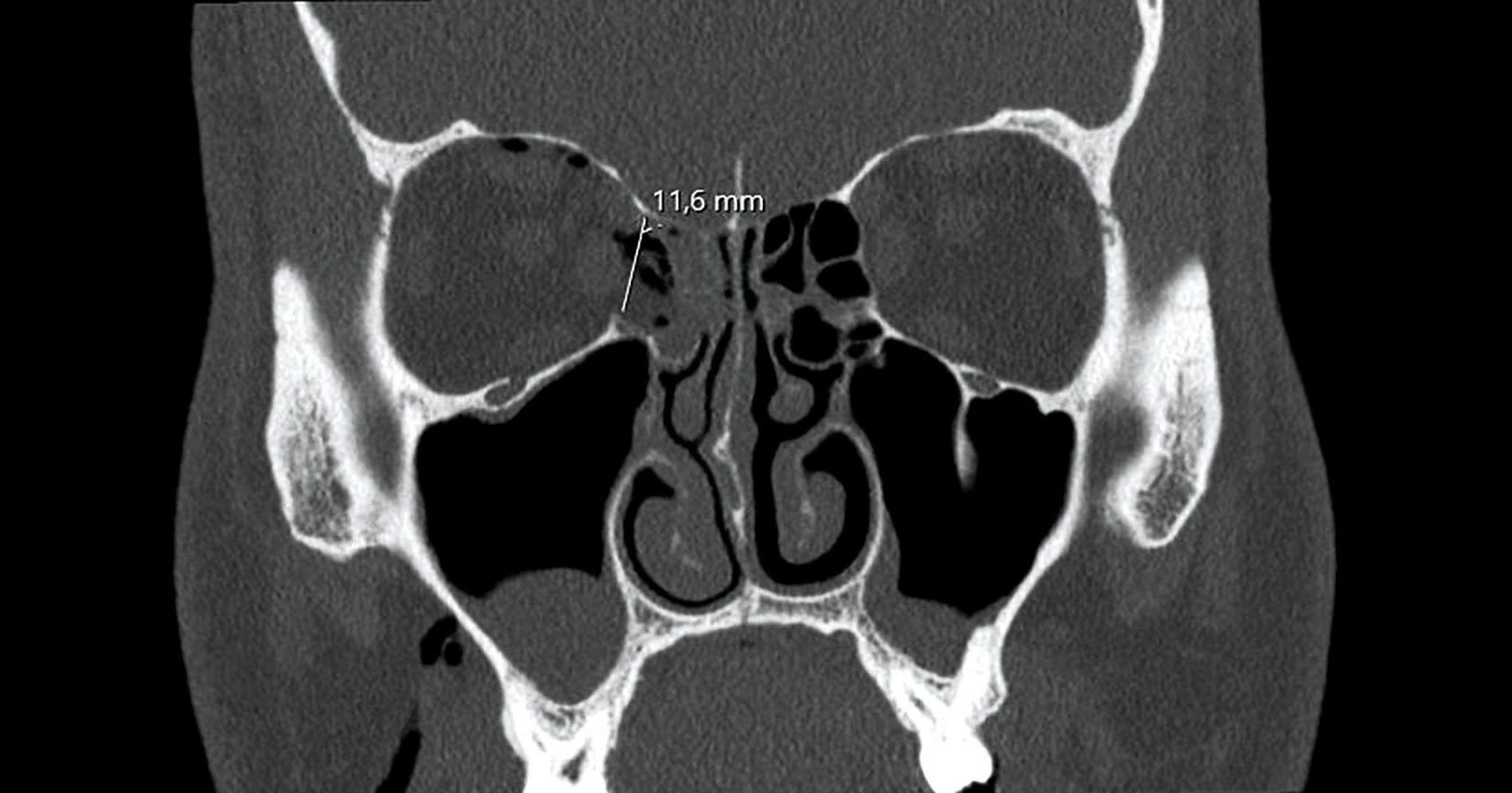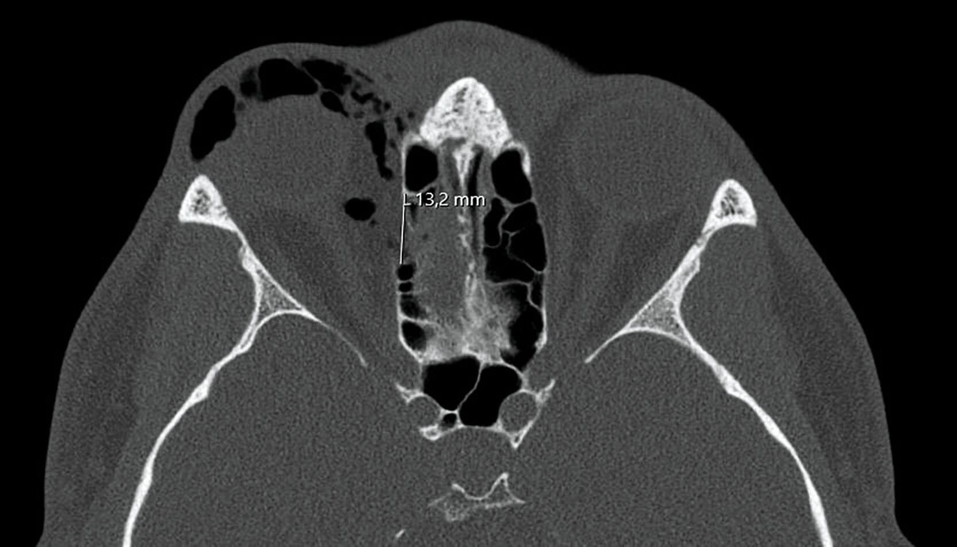 Bei der ophthalmologischen Untersuchung zeigte sich keine Trauma-induzierte Beeinträchtigung des Visus. Der Patient wurde stationär aufgenommen – zur Überwachung eines möglichen Schädel-Hirn-Traumas, zur intravenösen antibiotischen Therapie sowie zur regelmäßigen Kontrolle des Visus. Zusätzlich erhielt der Patient ein Schnäuzverbot und abschwellende Nasentropfen. Aufgrund der Komplexität der Fraktur – insbesondere aufgrund der Beteiligung der medialen Orbitawand – wurde die Indikation zur operativen Frakturversorgung und Rekonstruktion mittels eines patientenspezifischen Implantats (PSI) gestellt.