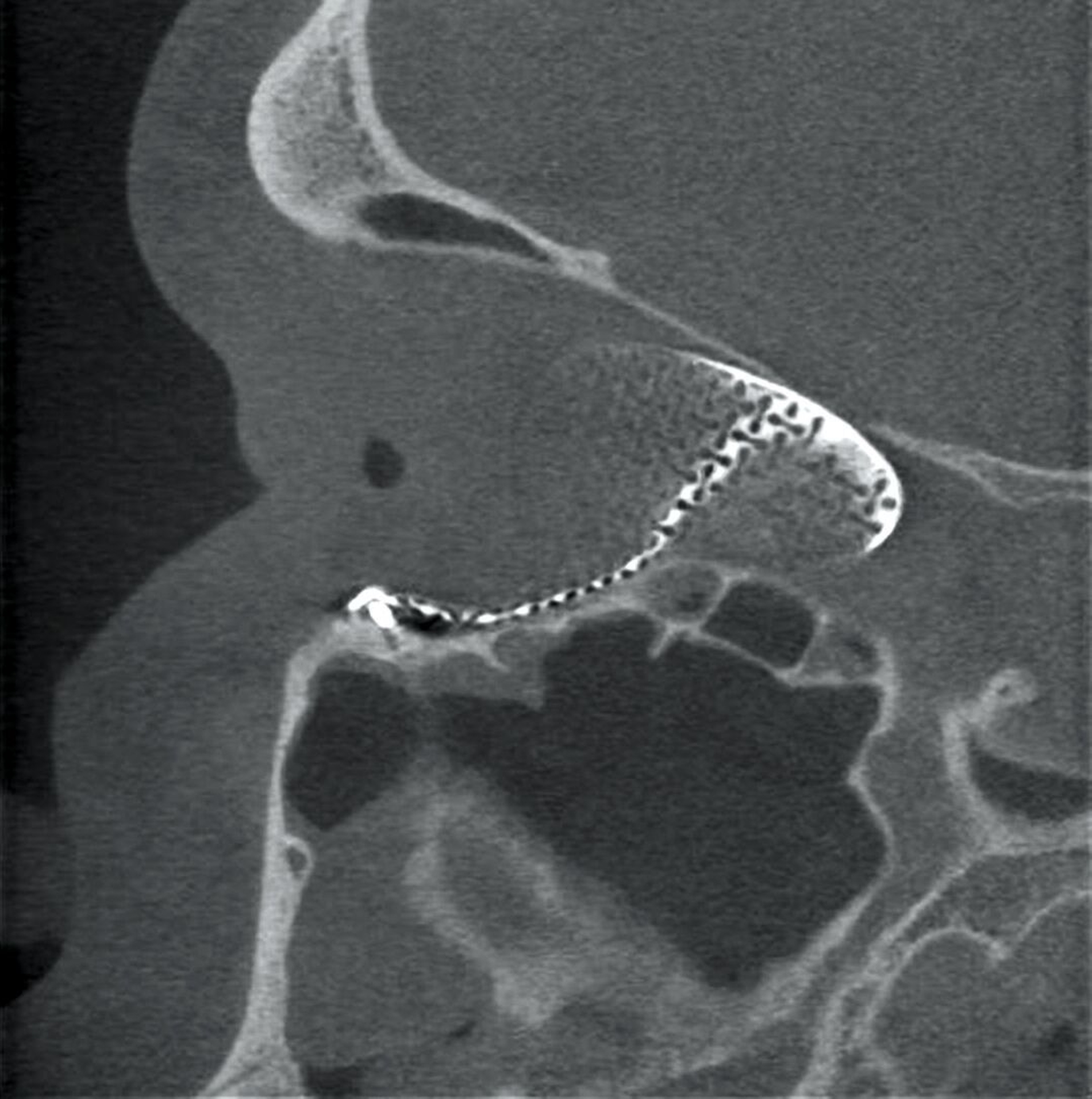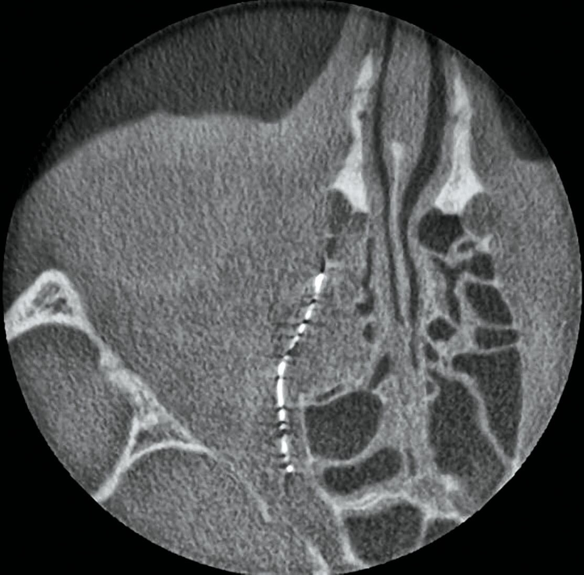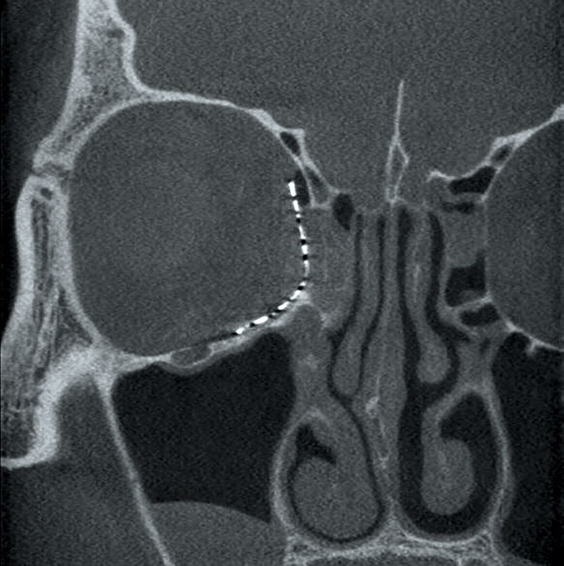 Danach wurde das angefertigte Orbitamesh in Intubationsnarkose über einen transkonjunktivalen-transkarunkulären Zugang zur Rekonstruktion der medialen Orbitawand nach Reposition des in den Defekt dislozierten Weichgewebes eingesetzt (Abbildung 3) und am Infraorbitalrand mit drei Osteosyntheseschrauben fixiert. Die postoperative Bildgebung mittels DVT zur Lagekontrolle zeigte eine korrekte Position des Implantats – entsprechend der präoperativen Planung (Abbildung 4).