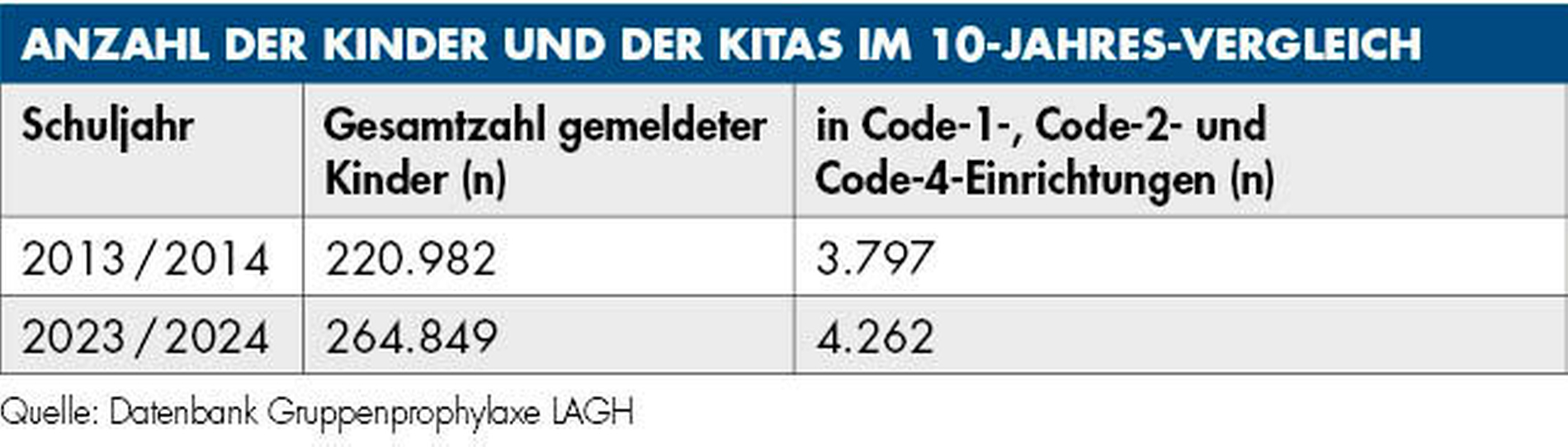 Im Schuljahr 2023/2024 waren insgesamt 43.867 Kinder mehr gemeldet als zehn Jahre zuvor. Die Anzahl der gruppenprophylaktisch zu betreuenden Kitas stieg in den vergangenen zehn Jahren um 465 Einrichtungen (Tabelle 1).