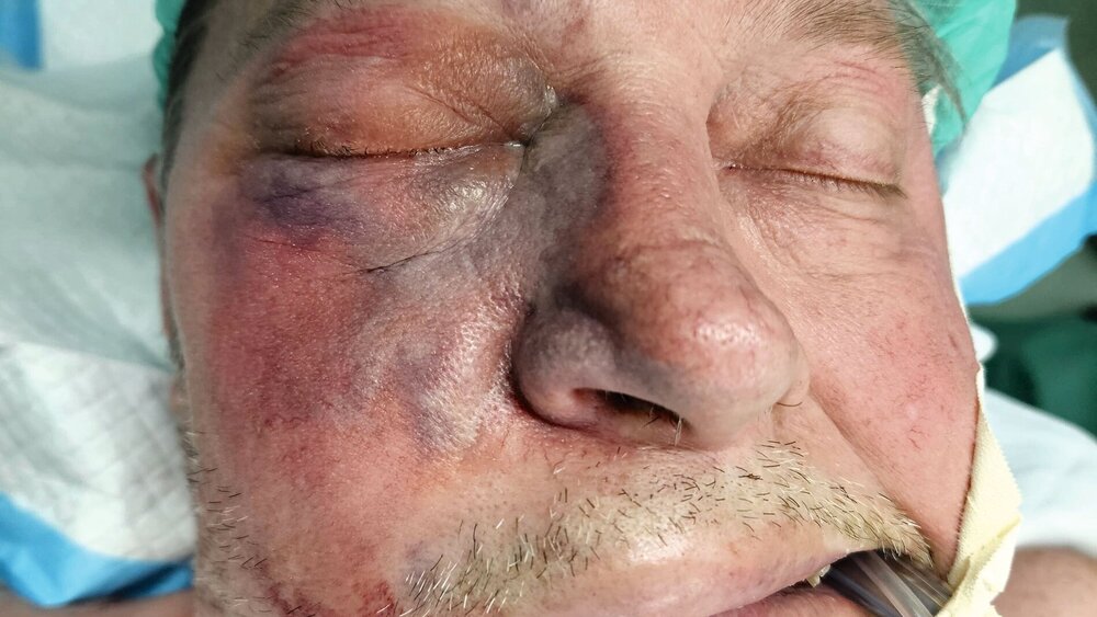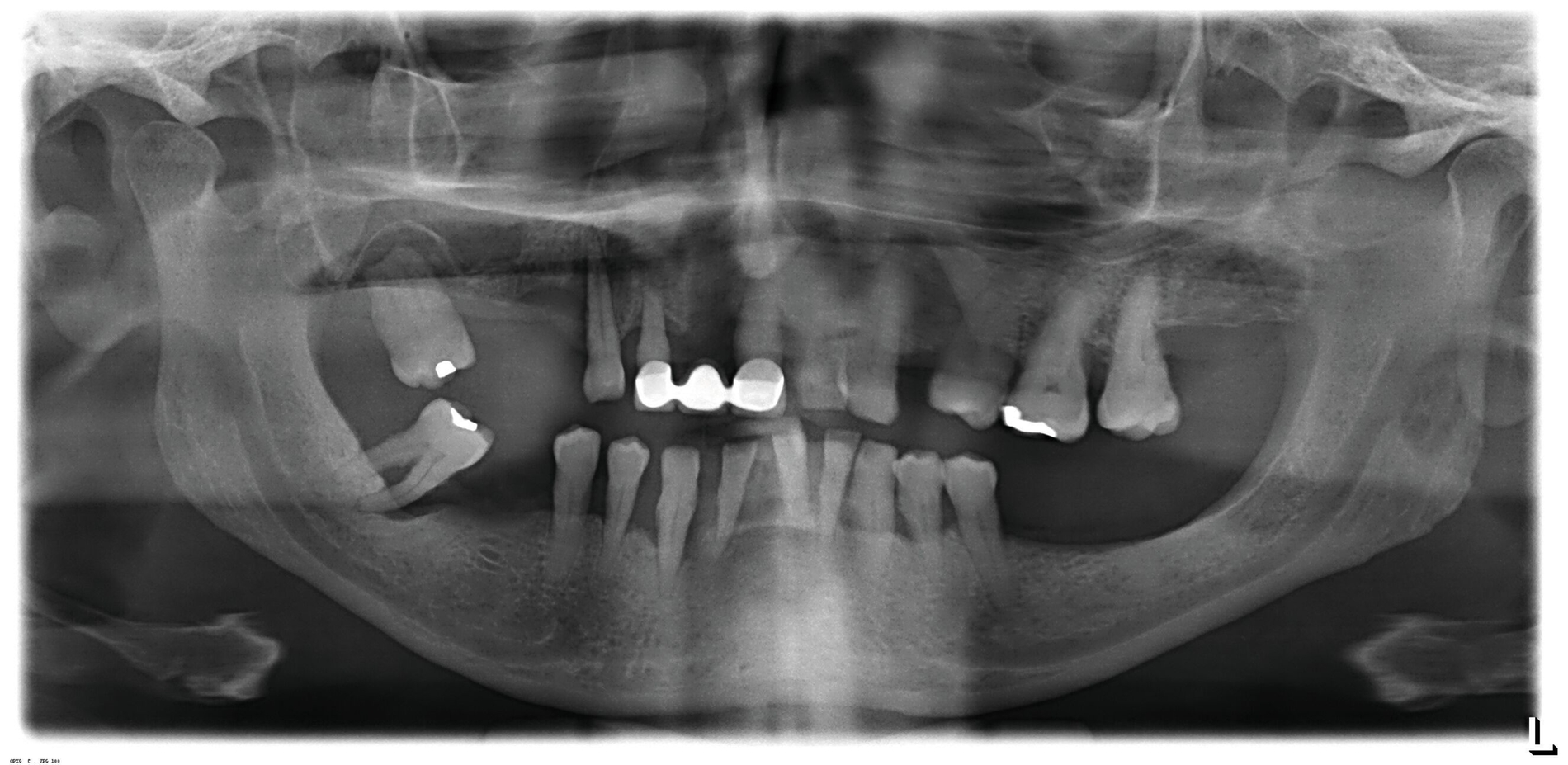 Ein 68-jähriger Mann stellte sich fußläufig in einem verwahrlosten und deutlich reduzierten Allgemeinzustand in der Notaufnahme des Evangelischen Krankenhauses Düsseldorf vor. Er berichtete bei gewisser Sprachbarriere über starke Schmerzen in der rechten Gesichtshälfte, die sich im Anschluss an eine Zahnentfernung entwickelt und im Verlauf verstärkt hätten. Vor sieben Tagen waren die Zähne 18, 14 und 48 extrahiert worden (Abbildung 2).
