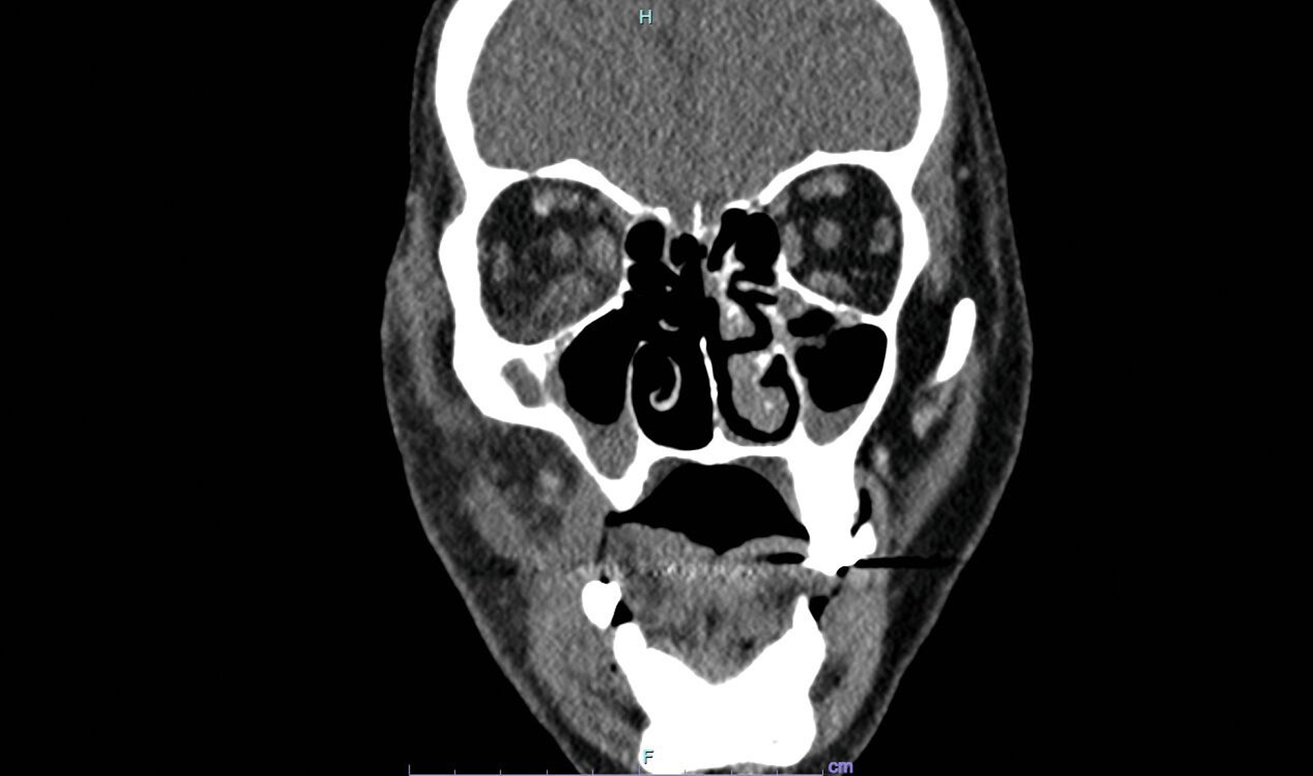 Laborchemisch offenbarte sich ein entgleister Diabetes mellitus mit einer Blutglukose von 507 mg/dl (HbA1c 11,4 Prozent) und diabetischer Ketoazidose (pH 7,15). Die Entzündungsparameter waren mit einer Leukozytenzahl von 18.000/µl und einem CRP von 30 mg/dl erhöht. Der Procalcitonin-Wert von 0,16 ng/ml sprach allerdings gegen eine bakterielle Infektion. Die Computertomografie des Schädels zeigte lediglich Resorptionen im Bereich der rechten Nasenhöhle und eine diskrete Volumenvermehrung des rechtsseitigen Wangen- und orbitalen Weichgewebes. Abszessformationen fanden sich, passend zum klinischen Befund, nicht (Abbildung 4).