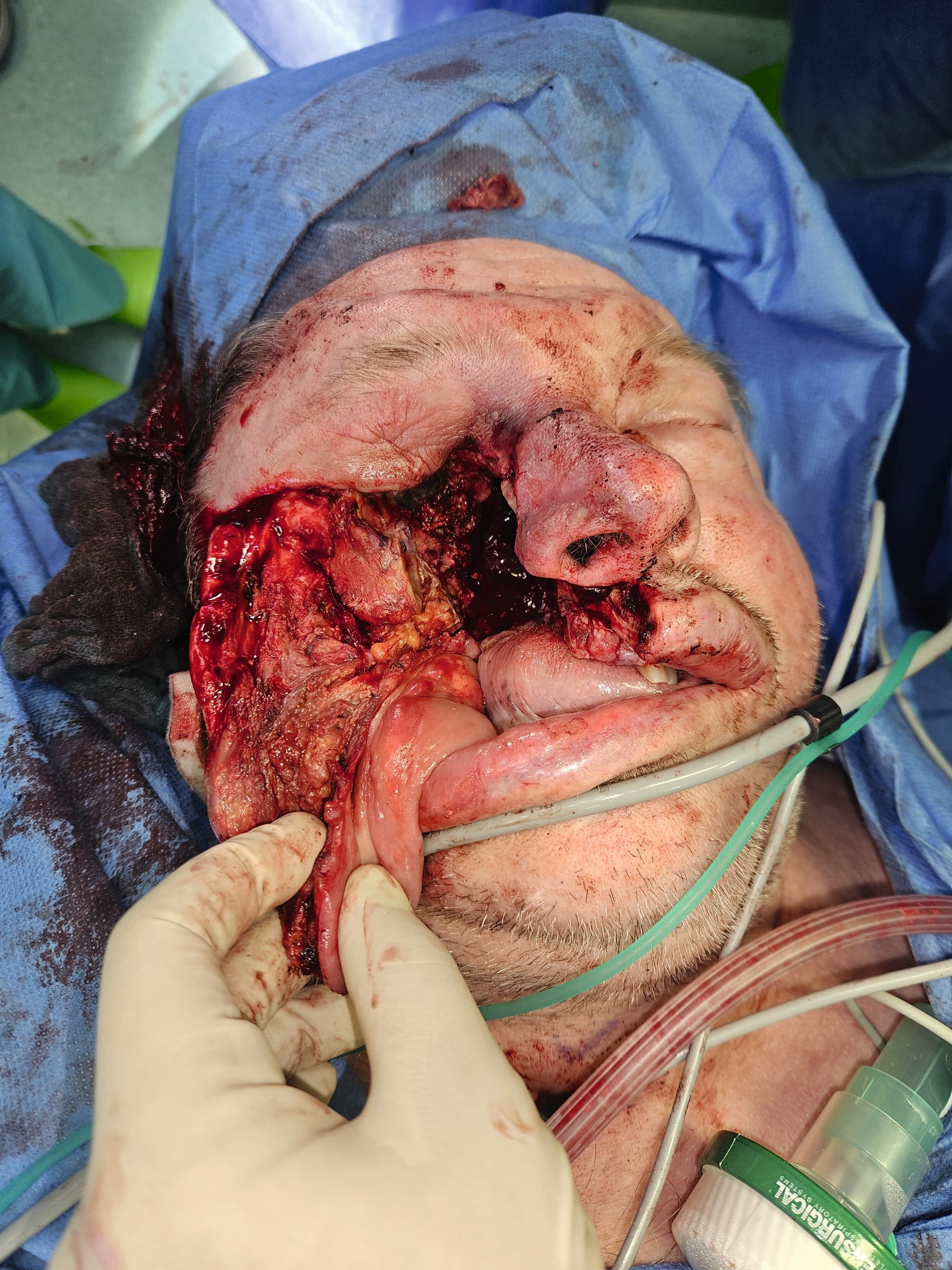 Aufgrund der Befundkonstellation und der Erfahrung des Behandlers mit einem ähnlichen Fall wurde bereits klinisch der Verdacht auf eine Mukormykose gestellt. Der Patient wurde über die lebensgefährliche Situation informiert und etwa fünf Stunden nach initialer Vorstellung operiert. Wie vermutet zeigten sich ausgedehnte Nekrosen der rechten Oberkiefer-, Jochbein- und Nasenregion.