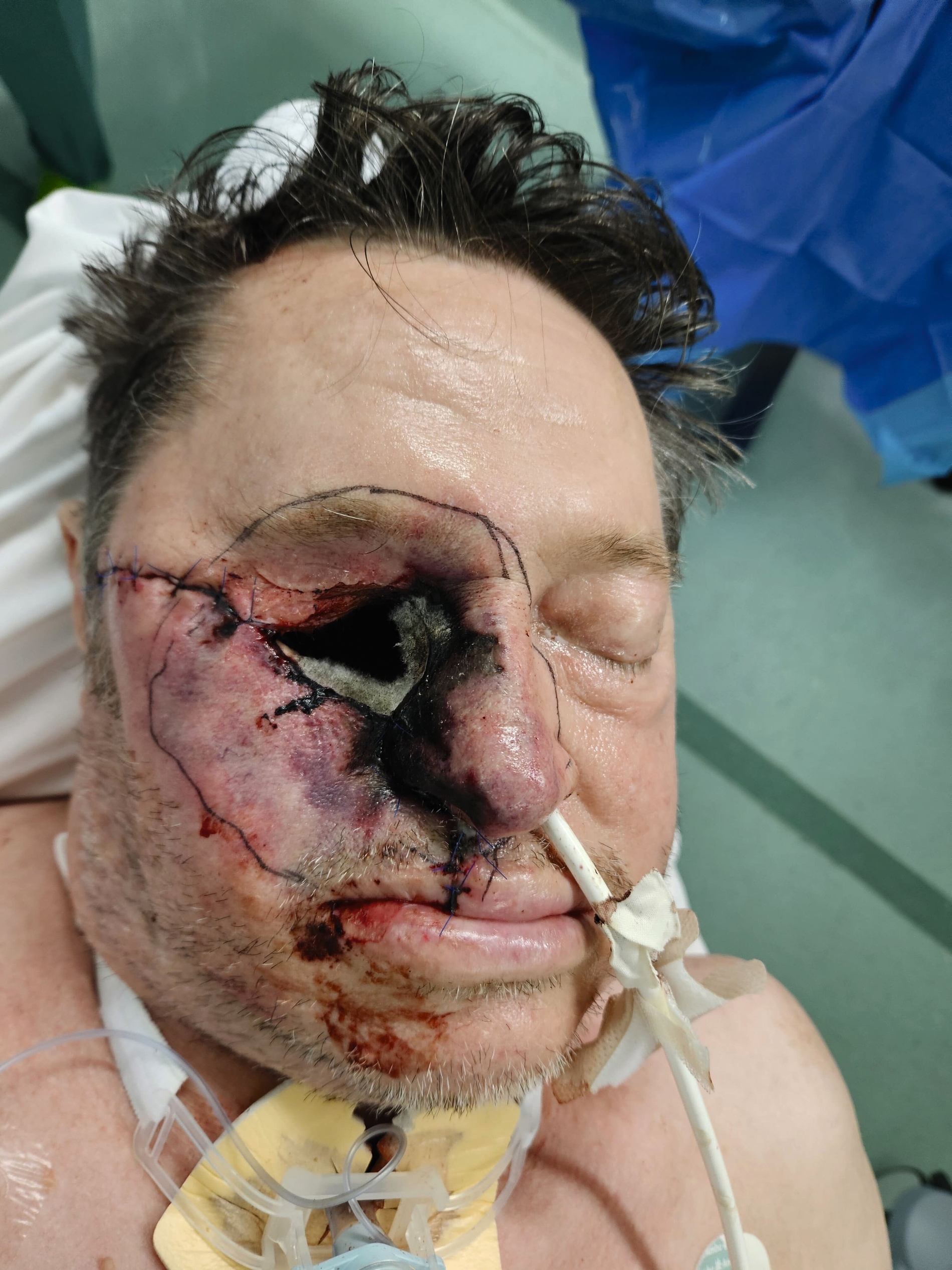 Am ersten postoperativen Tag wurde der Patient tracheotomiert und das Debridement komplettiert. Dies beinhaltete eine Exenteratio orbitae mit Entfernung des rechten Jochbeins sowie des kompletten Nasenseptums. Die initial begonnene antimykotische Therapie wurde, nach histopathologischer Bestätigung der Mukormykose, mit Voriconazol ergänzt.