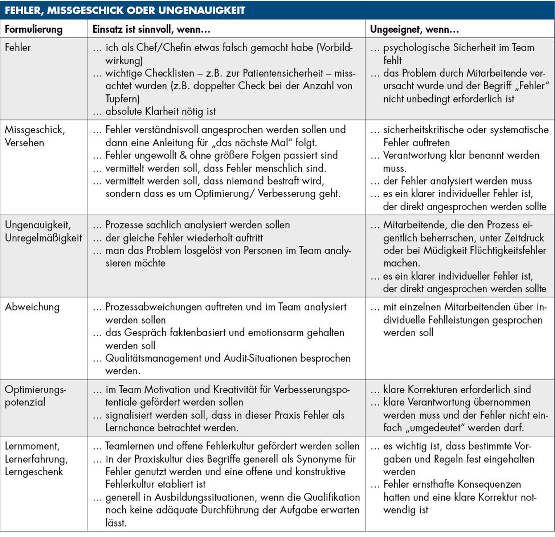 Zudem kann es das offene Fehlermanagement erleichtern, nur die eigenen Fehler als Fehler zu bezeichnen, die der Mitarbeitenden aber als Abweichungen, Ungenauigkeiten und Chance zur Optimierung zu benennen. Wenn Sie als Chefin oder Chef ihre eigenen Fehler als solche ausgeben, wird in der Praxis klar, dass Fehler normal sind und es einen konstruktiven Weg gibt, darüber zu reden.