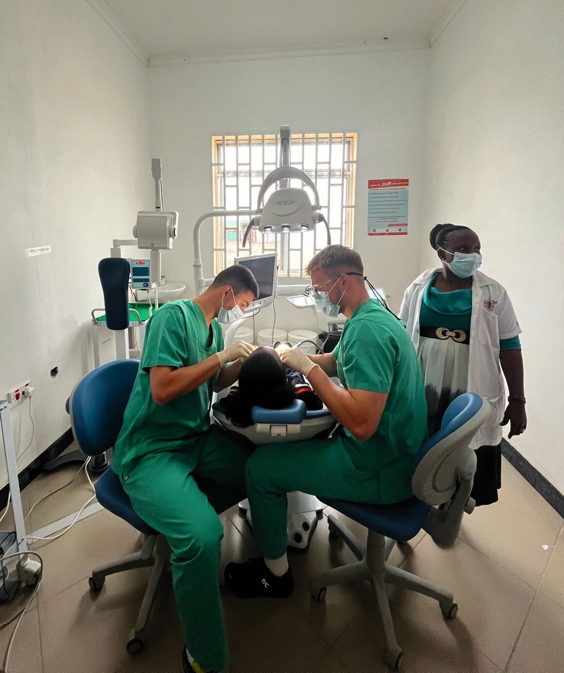 In den ersten Tagen im District Hospital haben wir uns an die eher entspannte Arbeitsmentalität und die Arbeitsbedingungen in Tansania „gewöhnt“. Beispielsweise ist im Krankenhaus in der Regel Strom vorhanden, aber nicht genug, um die Schleifer an der stationären oder der mobilen Einheit einsetzen zu können. Diese stoppen, sobald sie mit der Zahnhartsubstanz in Berührung kommen. Wir haben uns dann vor allem auf die Extraktionen mit Hebel und Zange konzentriert. Die Kommunikation mit den Patienten erfolgte größtenteils auf Suaheli, da nur wenige Englisch sprechen. So waren wir auf übersetzende Personen angewiesen, meist eine vor Ort tätige Schwester oder andere Mitarbeitende. Vor allem mit den Kindern und den Jugendlichen konnten wir aber direkt in Englisch kommunizieren.