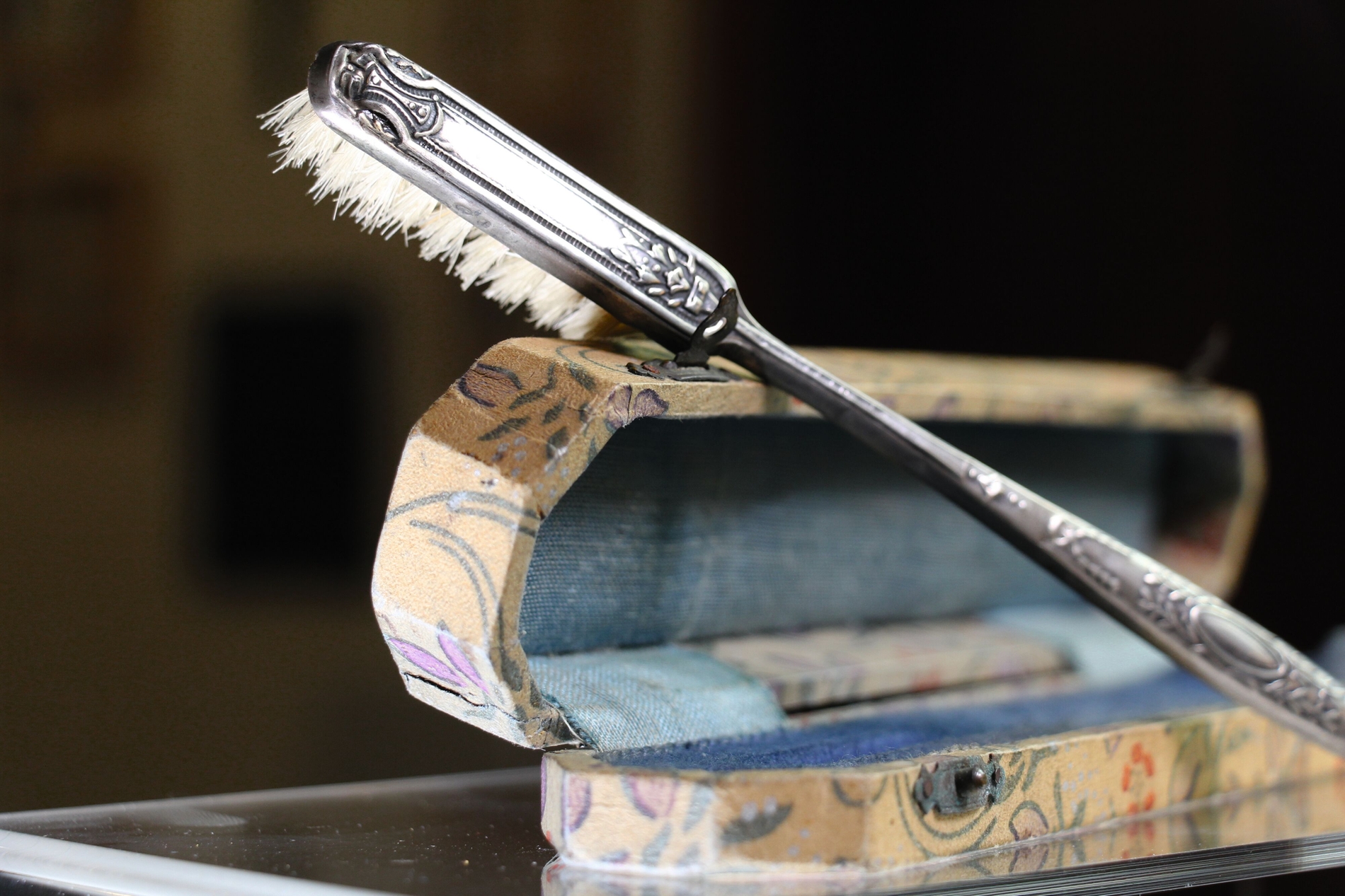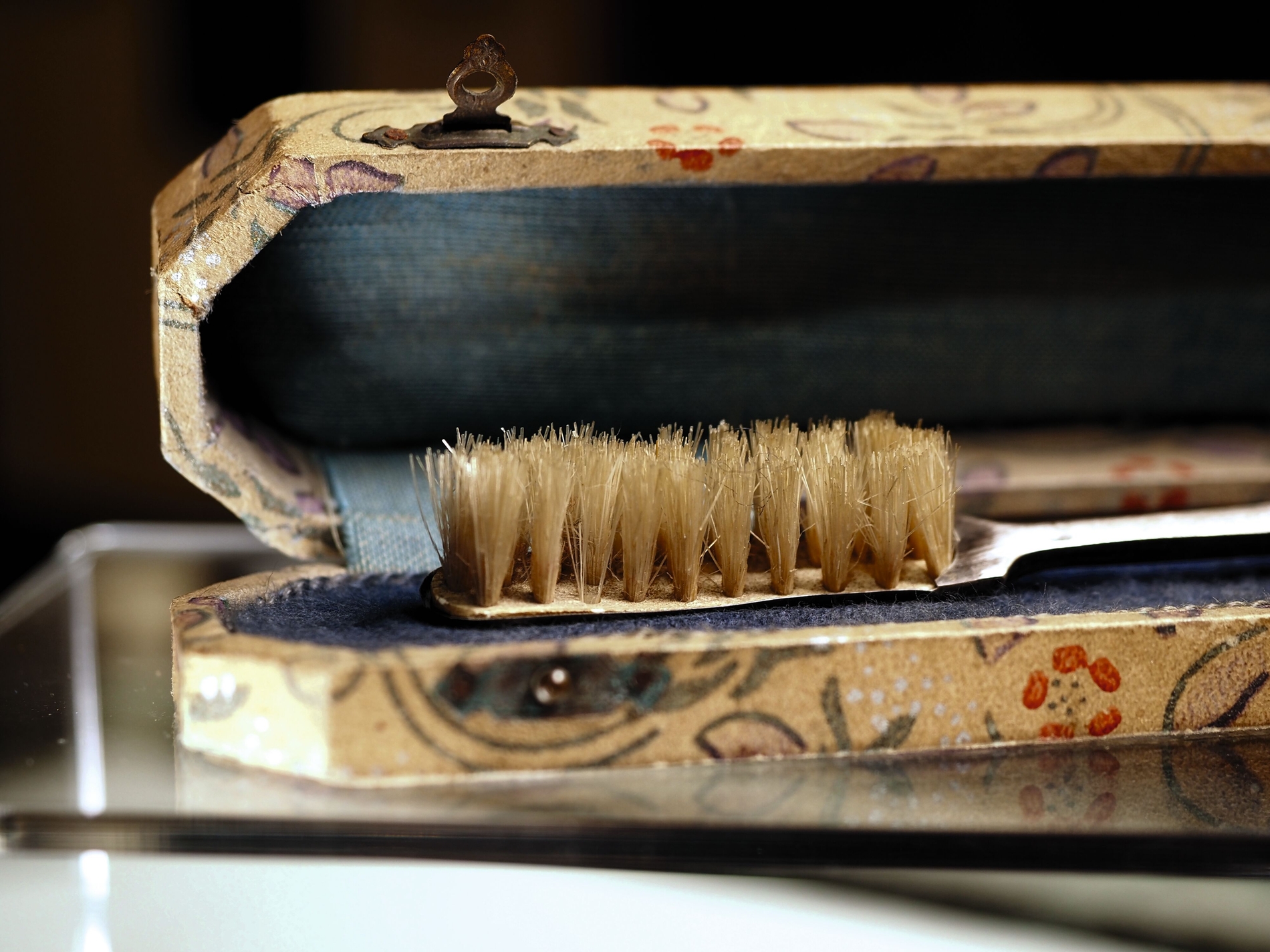 Besonders wertvoll bei unserer Zahnbürste ist dagegen das originale, handbemalte Etui. Die Bürste kommt aus Lissabon, Portugal. Aufgrund der überaus hochwertigen und seltenen Fertigung muss man auch hier von einem adeligen oder sogar hochadeligen Haushalt ausgehen. So hatte beispielsweise die Großherzogin Stephanie von Baden ebenfalls eine solche Zahnbürste, da sie verwandt mit Napoleon war.