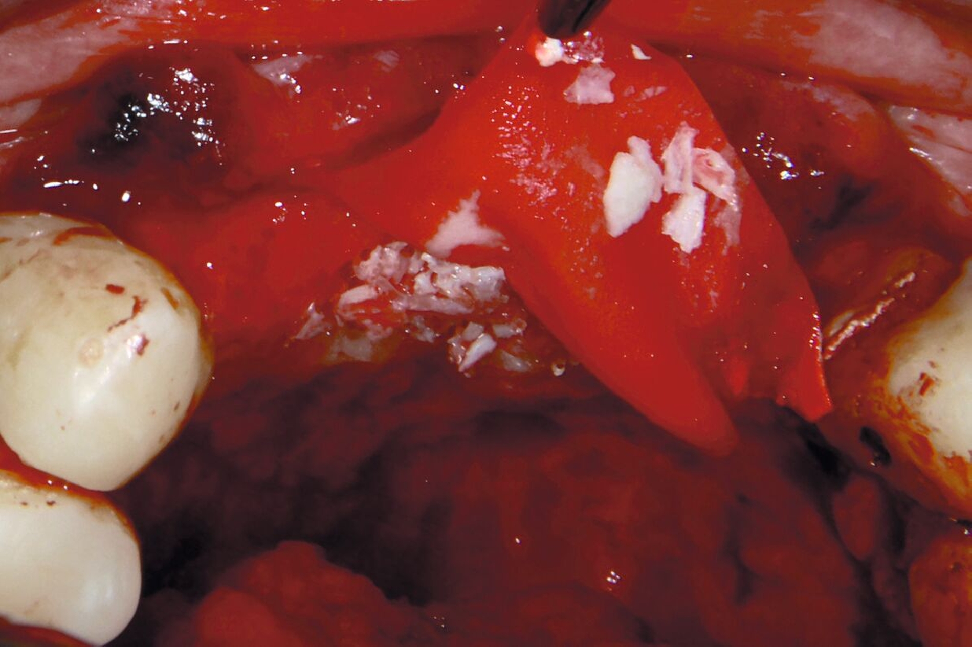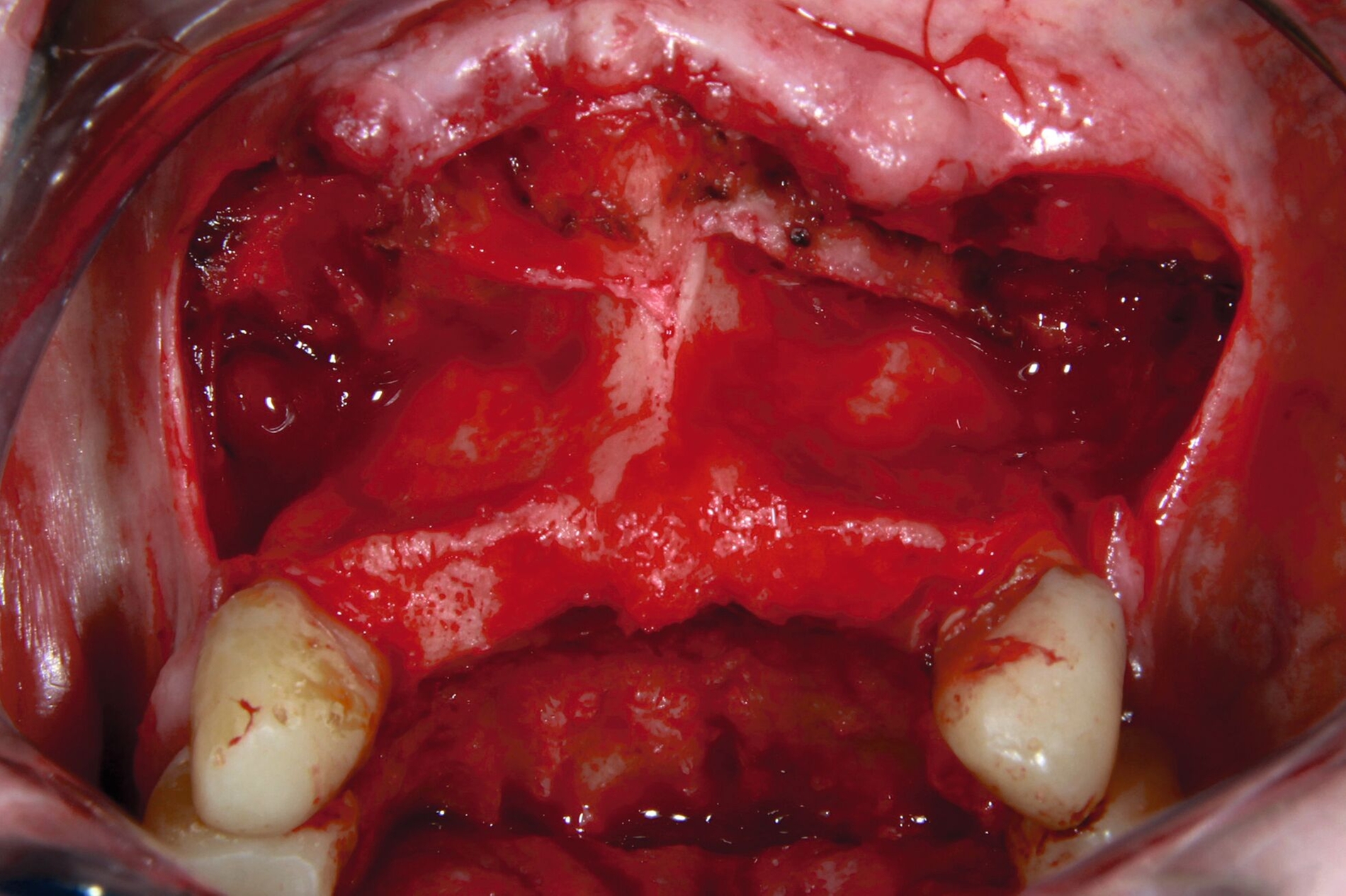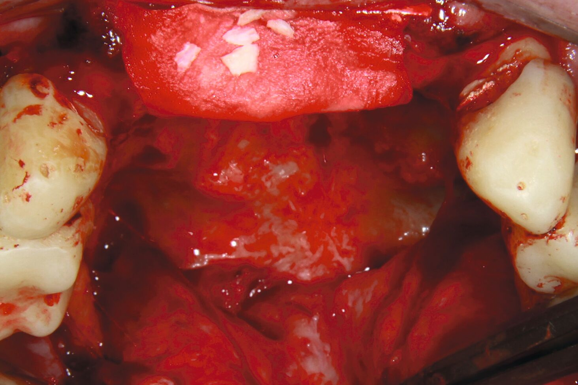 Um die Regeneration zu beschleunigen, wurde der Defekt mit Corticalis Granulat der Größe 0,212–0,85 mm (DIZG, Berlin, Deutschland), gemischt mit autologem Knochen und PRGF, hergestellt nach der ENDORET® Technologie (BTI Deutschland GmbH, Pforzheim, Deutschland), aufgefüllt. Die sogenannte geführte Knochenregeneration (Guided Bone Regeneration – GBR) schafft ein stabiles Widerlager, das das regenerative Potenzial autolog gewonnenen Knochens nutzt, die knöcherne Regeneration in der unbelasteten Region des anterioren Gaumens fördert und einen stabilen Untergrund für den Wundverschluss bildet.