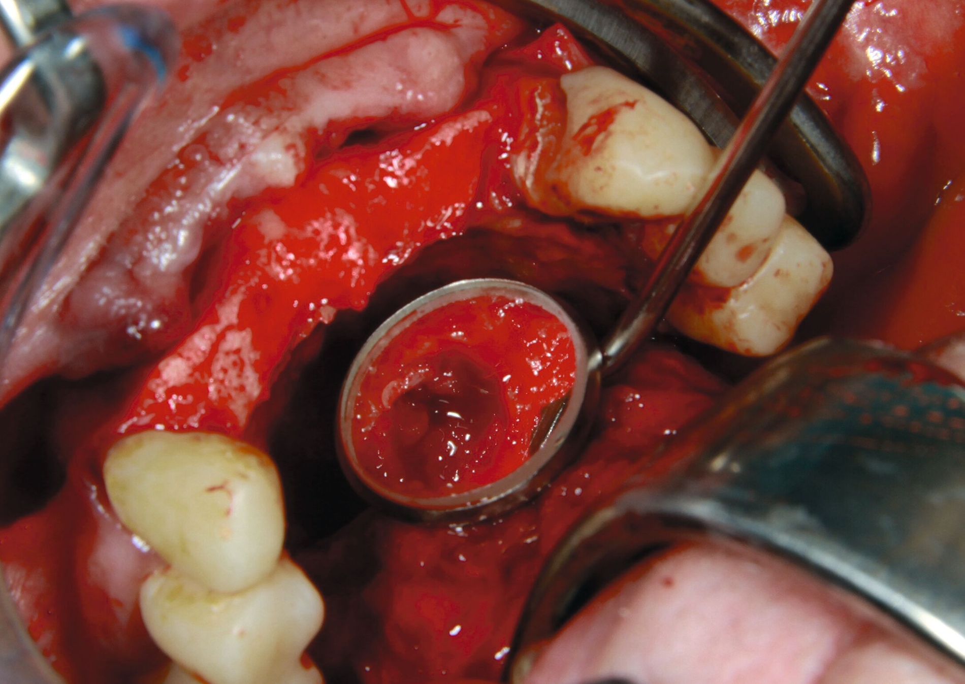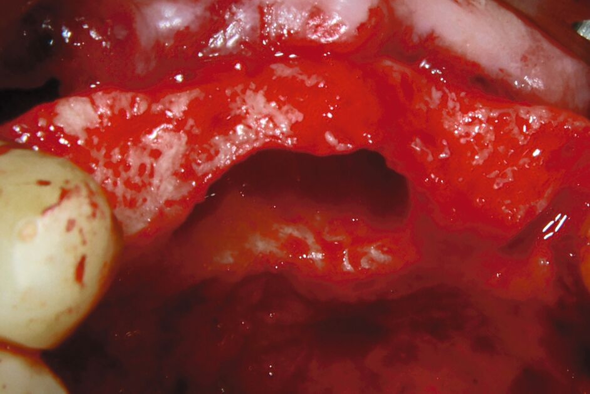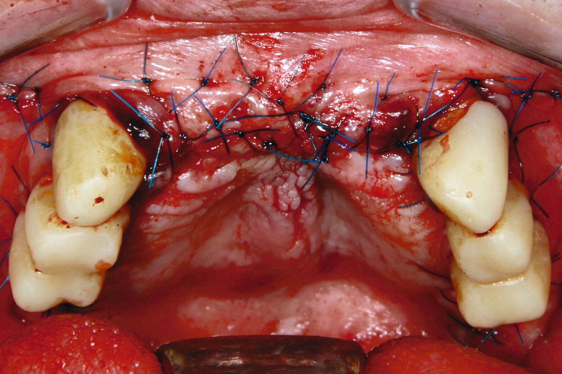 Um die Regeneration zu beschleunigen, wurde der Defekt mit Corticalis Granulat der Größe 0,212–0,85 mm (DIZG, Berlin, Deutschland), gemischt mit autologem Knochen und PRGF, hergestellt nach der ENDORET® Technologie (BTI Deutschland GmbH, Pforzheim, Deutschland), aufgefüllt. Die sogenannte geführte Knochenregeneration (Guided Bone Regeneration – GBR) schafft ein stabiles Widerlager, das das regenerative Potenzial autolog gewonnenen Knochens nutzt, die knöcherne Regeneration in der unbelasteten Region des anterioren Gaumens fördert und einen stabilen Untergrund für den Wundverschluss bildet.