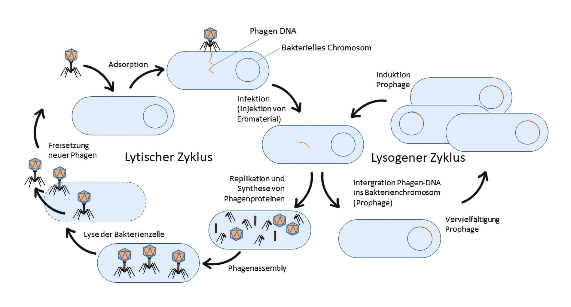 Einige Bakteriophagen können jedoch auch einen sogenannten lysogenen Zyklus durchlaufen, bei dem sie ihr Erbgut in das ihres Bakterienwirts integrieren, ohne sie dabei sofort zu zerstören. Dann werden sie als Prophagen bezeichnet. Prophagen besitzen oftmals Virulenzgene und haben Einfluss auf die Pathogenität ihres Wirtsbakteriums [Canchaya et al., 2003]. Sie können zudem einen lateralen Gentransfer ermöglichen, was im Hinblick auf die Ausbreitung von Antibiotika-Resistenzgenen ein Risiko darstellt. Deshalb werden lysogene und transduzierende Phagen für medizinische Zwecke nicht in Betracht gezogen.