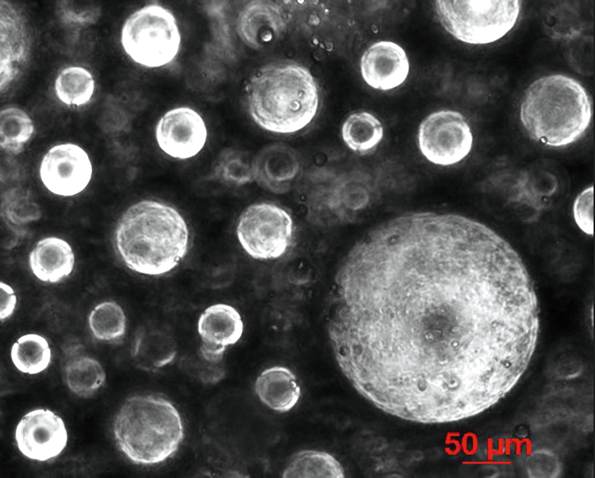 Am Fraunhofer-Institut für Grenzflächen- und Bioverfahrenstechnik IGB in Stuttgart wurde eine Machbarkeitsstudie durchgeführt, um das Potenzial von Bakteriophagen zur gezielten Bekämpfung von Karieserregern zu erheben. Das Projekt Kari-EX, initiiert von Prof. Dr. Susanne Bailer und Jens Wetschky, bildete die Grundlage für diese Studie. Eine Idee ist die Entwicklung eines Kaugummis, der Bakteriophagen enthält und diese kontrolliert in der Mundhöhle freisetzt (Abbildung 8). Im Rahmen des Projekts Kari-EX wurde untersucht, ob der gut erforschte Bakteriophage M102, der spezifisch gegen Streptococcus mutans wirkt, nach einer Verkapselung in lebensmitteltauglichem Alginat – einer gelartigen Substanz – seine Aktivität behält. Die Verkapselung ermöglichte es, die Phagen mit etwas Flüssigkeit in kleineren Sphären einzubetten (Abbildung 9). Bereits ohne weitere Optimierung konnte durch die gezielte Auflösung der Kapseln eine große Zahl aktiver Phagen freigesetzt und nachgewiesen werden. Da Bakteriophagen hochspezifisch wirken, könnte die Entwicklung eines Kari-EX-Kaugummis das Risiko für Dysbiosen reduzieren und gleichzeitig das nützliche orale Mikrobiom schonen.