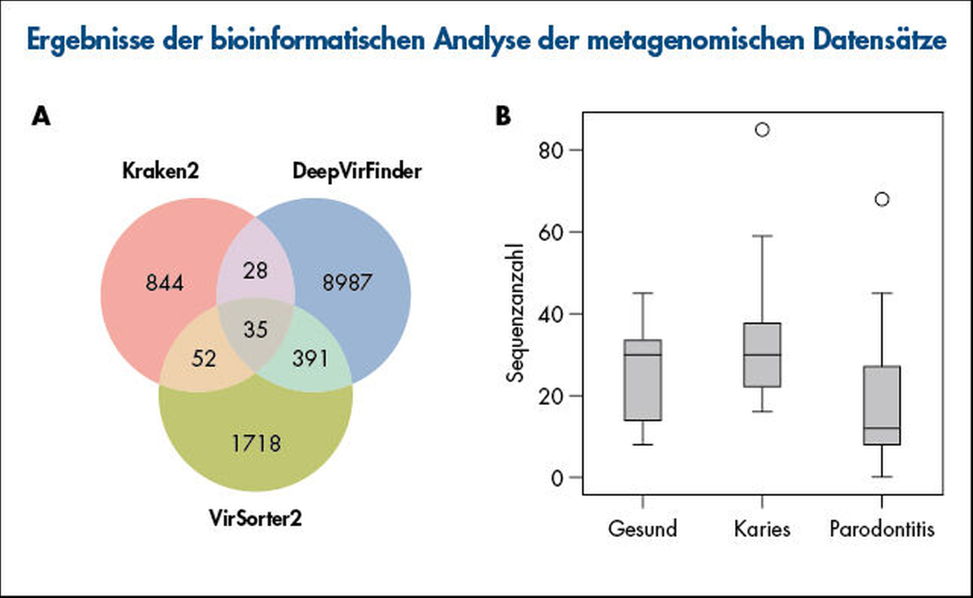Die Rolle von Bakteriophagen innerhalb der oralen Mikrobiota ist jedoch noch nicht geklärt. Ein bioinformatischer Ansatz soll dabei unterstützen, bislang unbekannte Phagen zu identifizieren und deren Wechselwirkungen mit dem oralen Mikrobiom zu verstehen. Metagenomische Datensätze sind essenziell für die Untersuchung der Zusammensetzung und Variation von Bakteriophagen in der Mundhöhle. Unterschiedliche Studien [Szafrański et al., 2021; Labrie et al., 2010; Voit et al., 2022] weisen auf eine mögliche Verbindung zwischen Bakteriophagen und der mikrobiellen Gemeinschaftsstruktur hin. Während das orale Mikrobiom nachweislich eine Rolle bei der Entstehung von Parodontalerkrankungen und Periimplantitis spielt, ist die spezifische Funktion von Viren in diesen mikrobiellen Netzwerken bislang unzureichend erforscht.