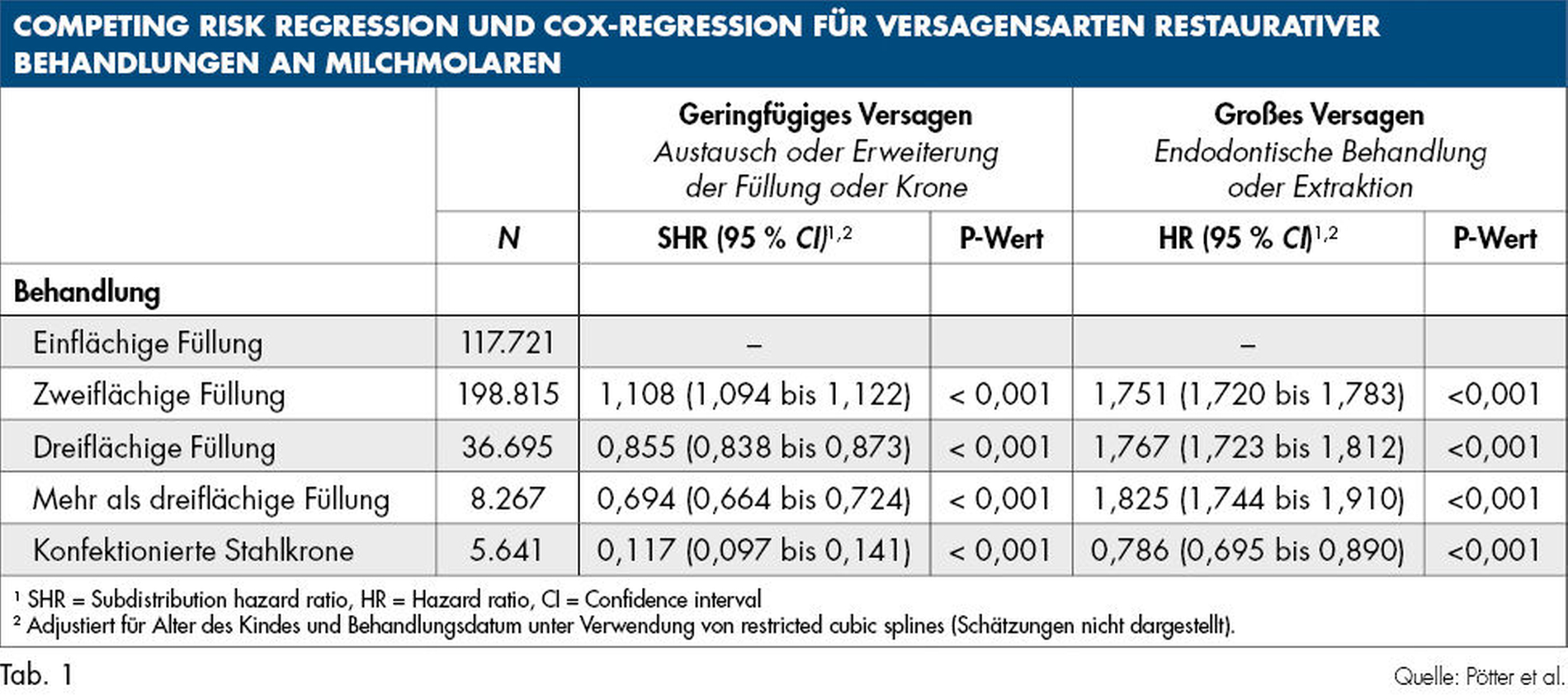 Kategorisiert wurde nach der Anzahl der Flächen einer Füllung beziehungsweise ob eine Stahlkrone abgerechnet wurde. Die Endpunkte wurden aufgeteilt in erfolgreich (keine Re-Intervention innerhalb des siebenjährigen Beobachtungszeitraums), geringfügiges Versagen (Erneuerung der Füllung oder Krone) oder großes Versagen (Pulpotomie oder Extraktion). Die statistische Analyse erfolgte mittels eines konkurrierenden Risikomodells (Fine-und-Gray-Modell) und einer Cox-Regression, um das Risiko für Re-Interventionen zu bewerten.