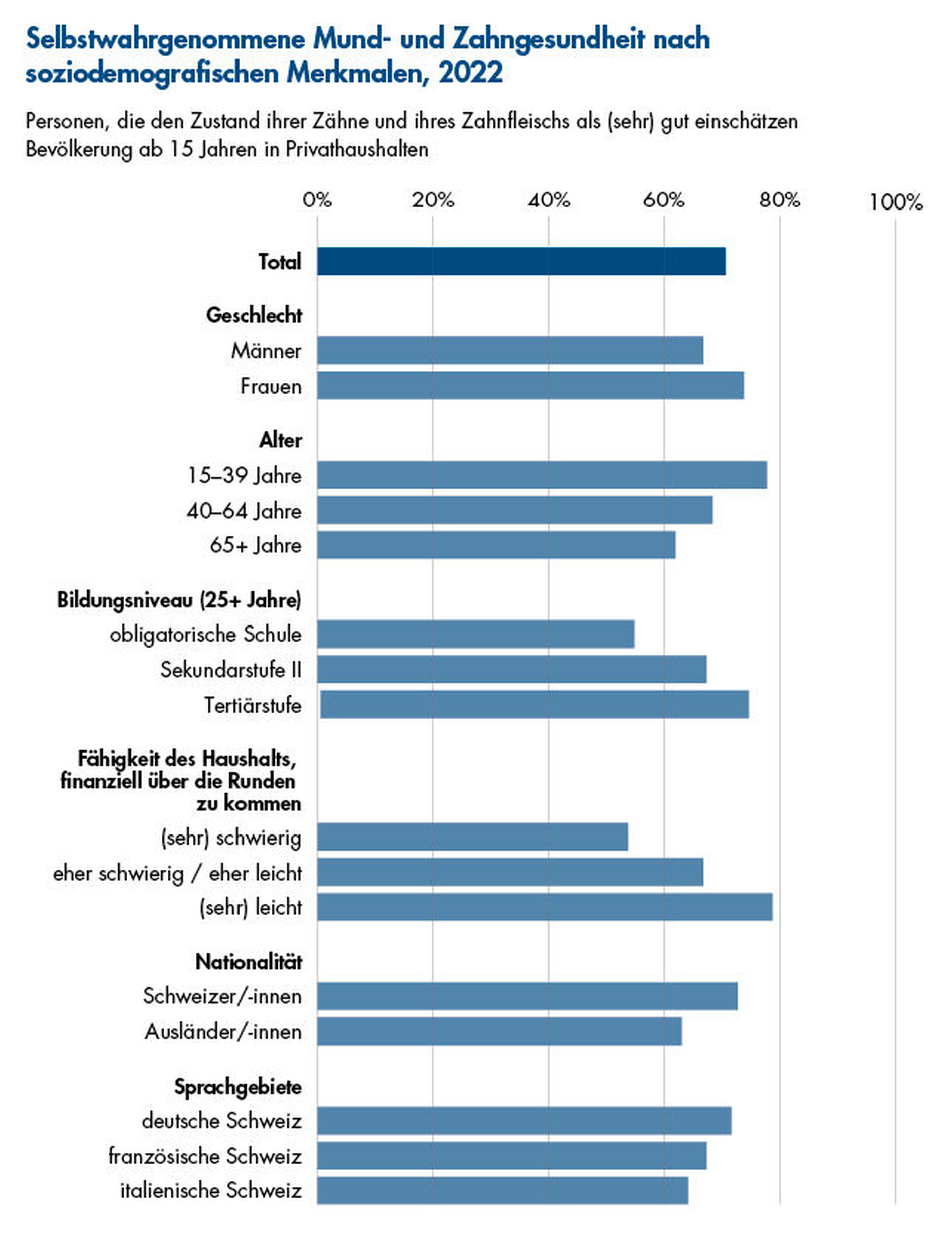 2022 hatten 44 Prozent der Bevölkerung ein vollständiges natürliches Gebiss, 2002 waren das nur 33 Prozent. Insbesondere mehr Frauen haben alle Zähne. Generell ist der Anteil aber im Alter zwischen 25 und 64 Jahren umso größer, je höher man beruflich qualifiziert ist. In dieser Altersgruppe haben nur 25 Prozent der Personen ohne nachobligatorische Ausbildung ein vollständiges natürliches Gebiss, gegenüber 45 Prozent der Personen mit einem Abschluss auf Sekundarstufe II und 56 Prozent der Personen mit einem Tertiärabschluss. Diese sozialen Unterschiede sind seit 2002 unverändert.