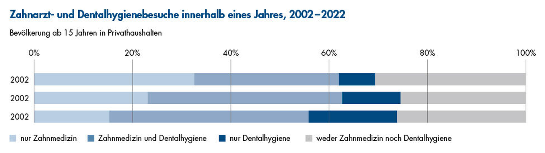 Der Anteil der Schweizer, der im Laufe eines Jahres zur Dentalhygiene geht, stieg um 21 Prozentpunkte (2002: 37 Prozent; 2022: 58 Prozent), während die Zahnarztbesuche um 6 Prozentpunkte zurückgingen (2002: 62 Prozent; 2022: 56 Prozent). Insgesamt nahmen fast drei Viertel der Bevölkerung zahnärztliche und/oder dentalhygienische Leistungen in Anspruch (74 Prozent).