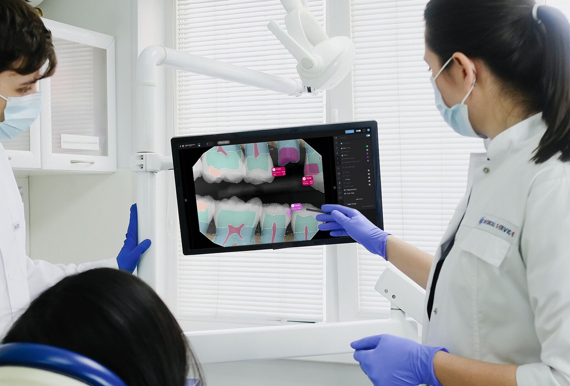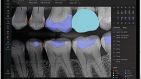 Mittels Nahinfrarot-Bildgebung oder Röntgen lassen sich kariöse Läsionen – ebenfalls KI-gestützt – visualisieren und für Diagnosen und Behandlungsvorschläge nutzen (Abbildung 2). Schnittstellen mit Anbietern von Intraoralscannern und Digitalen Volumentomografen bietet die kalifornische Firma Pearl, nach eigenen Angaben führender Anbieter von KI-Lösungen in der oralen Medizin. Ein Scanner-Softwaremodul des Unternehmens 3Shape bietet eine „zweite Meinung“, die für Diagnosen aufgrund von Bildbefunden – zum Beispiel zu Rezessionen – und Fluoreszenz-gestützten Kariesbefunden nutzbar ist. Mit dem Begriff „Zweitmeinung“ wird deutlich, dass die KI die Diagnose nicht übernehmen, sondern nur als Werkzeug unterstützen soll.