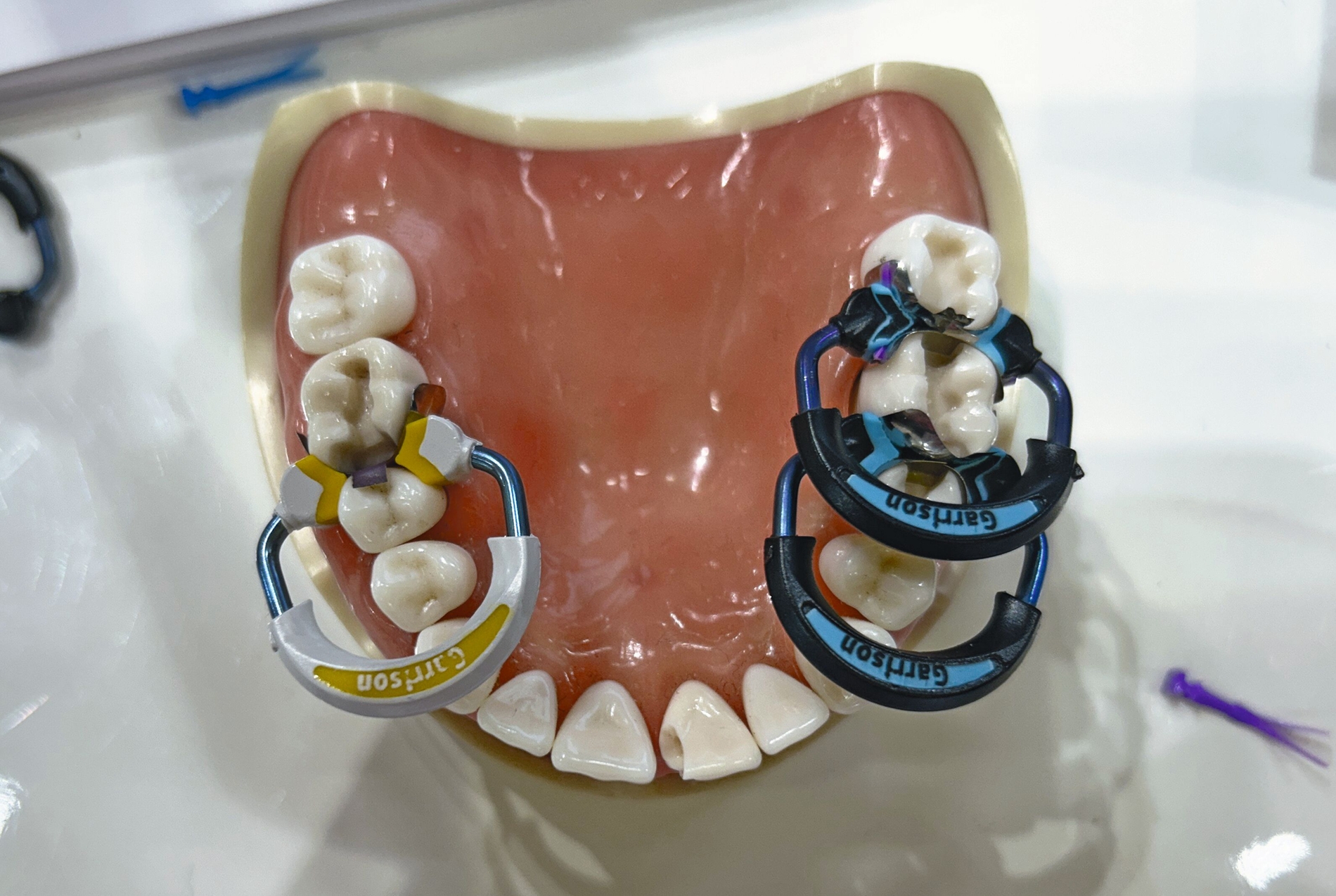 Zahn-, weichgewebsbezogene und überhaupt orale Medizin ist oft Detailarbeit an kleinen Strukturen. Daher erleichtern gut funktionierende Instrumente und kleinere Hilfsmittel den Behandlungsalltag erheblich. Das könnte auch für ein neues Teilmatrizensystem gelten, das bei zwei benachbarten Klasse-II-Kavitäten in Verbindung mit speziellen, geteilten Kunststoffkeilen für eine bessere Abdichtung in kritischen Bereichen sorgen soll (Garrison, Abbildung 6). Ein verstellbarer Doppelhaken zum Abhalten von Lippen und Lappen könnte oralchirurgische Eingriffe erleichtern (Carl Martin, Abbildung 7). Ebenfalls neu für die Chirurgie ist ein „lineares“ Präparationssystem für Knochen einschließlich Implantatbett auf dem Markt. Es wird mit piezoelektrischem Ultraschall betrieben und erlaubt laut Anbieter schonendere und präzisere Eingriffe als mit Spiralbohrern (mectron).