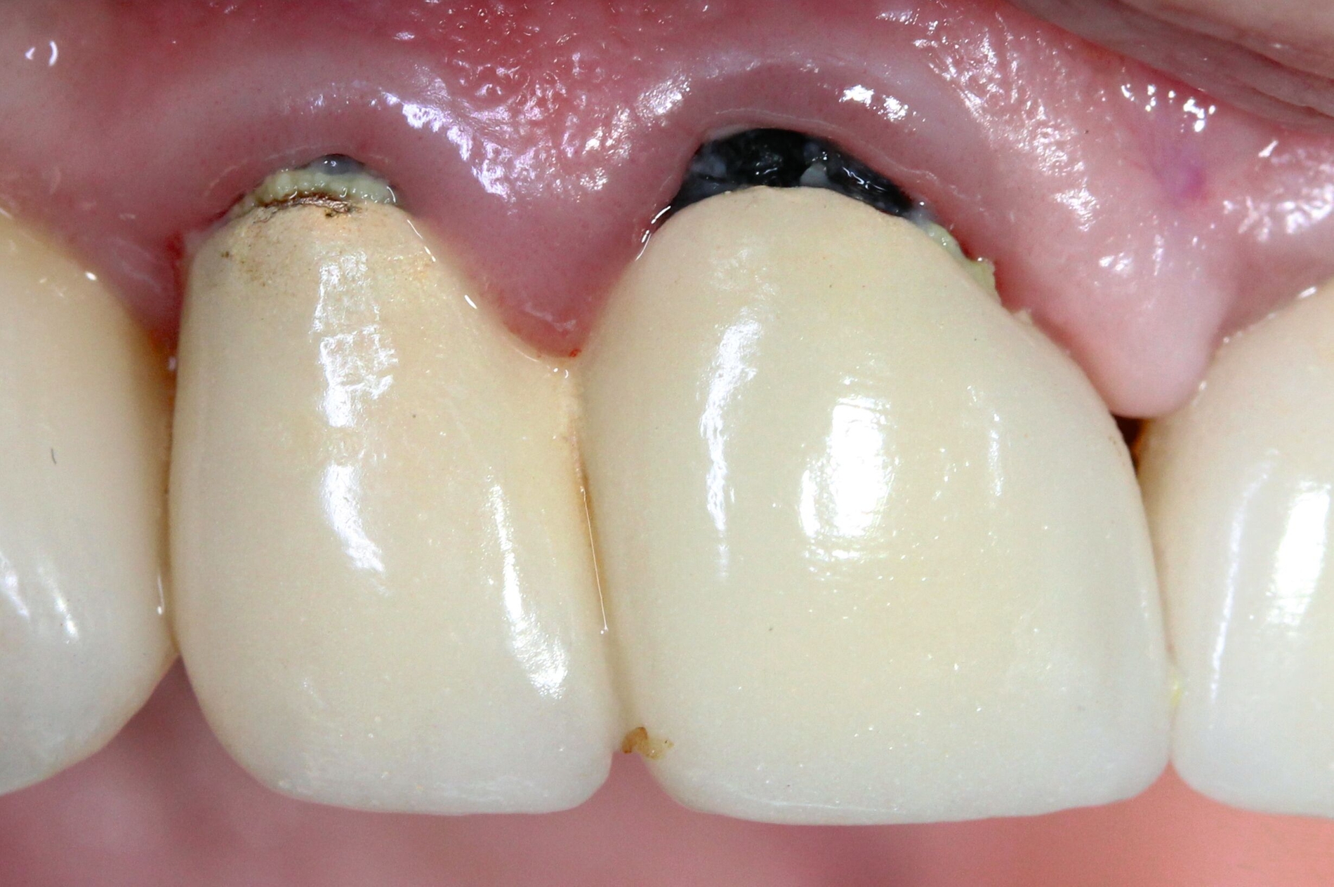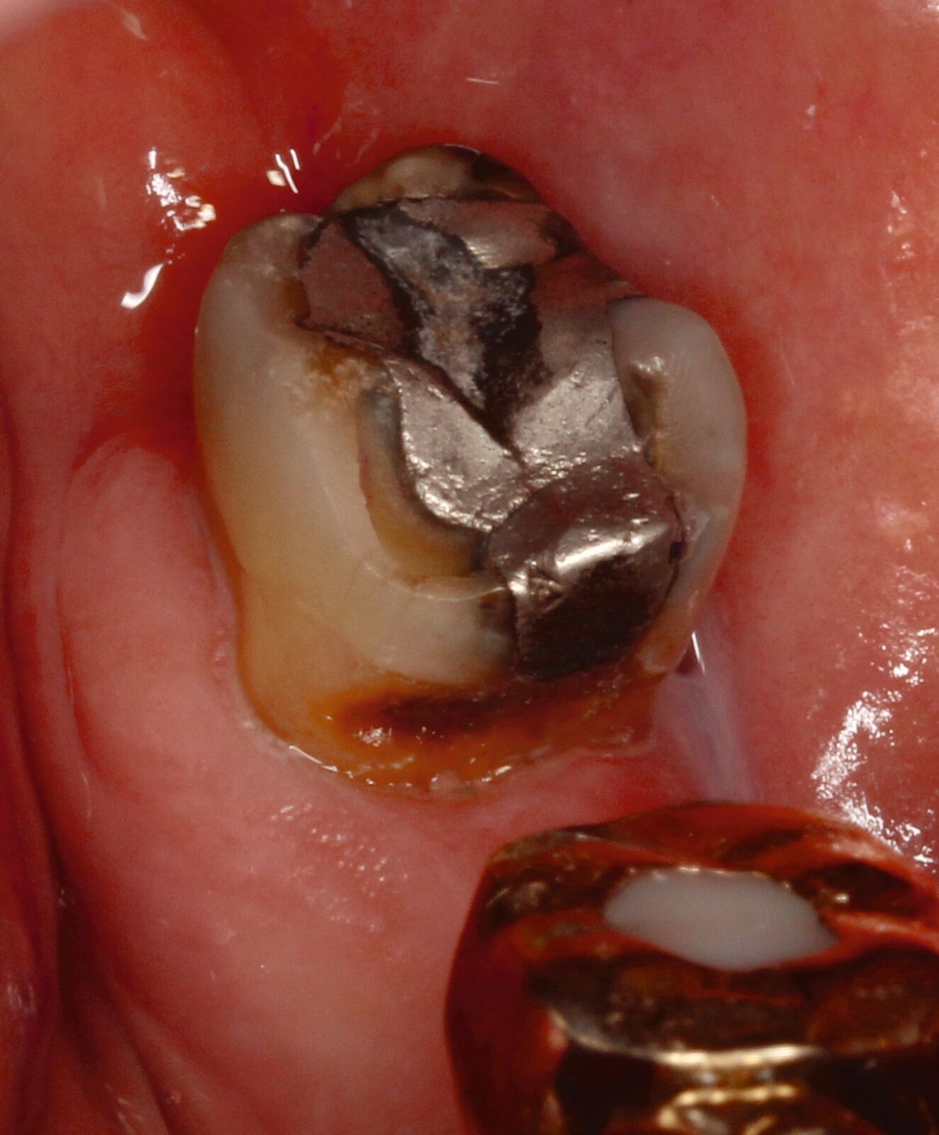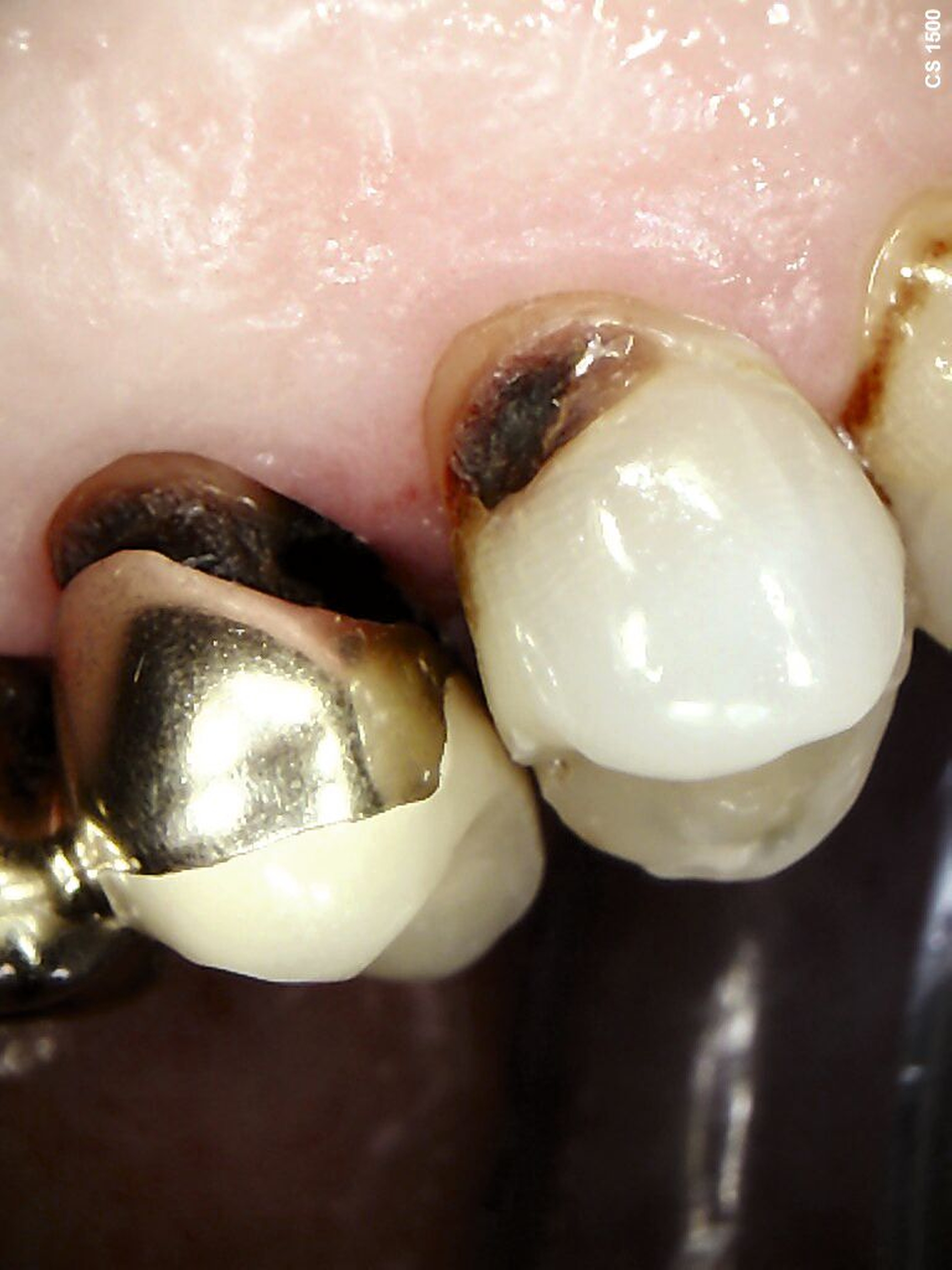 Eine bekannte Nebenwirkung bei Anwendung auf kariösen Läsionen ist die Schwarzfärbung des behandelten Bereichs (Abbildungen 3, 4). Verfärbungen können aber auch bei Applikation auf kariesfreien Wurzeloberflächen entstehen, diese sind jedoch mit einer professionellen Zahnreinigung gut zu entfernen (Abbildung 2).