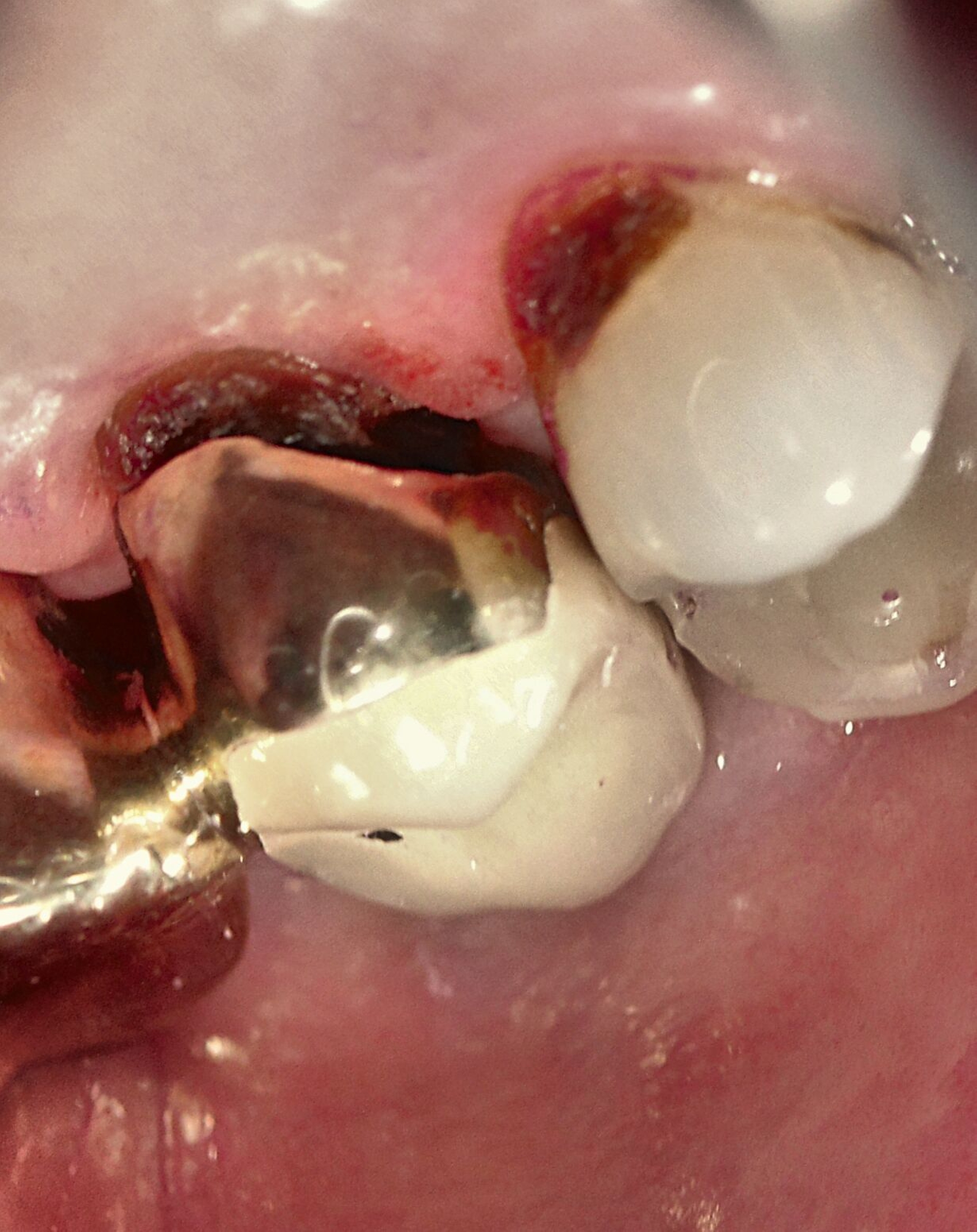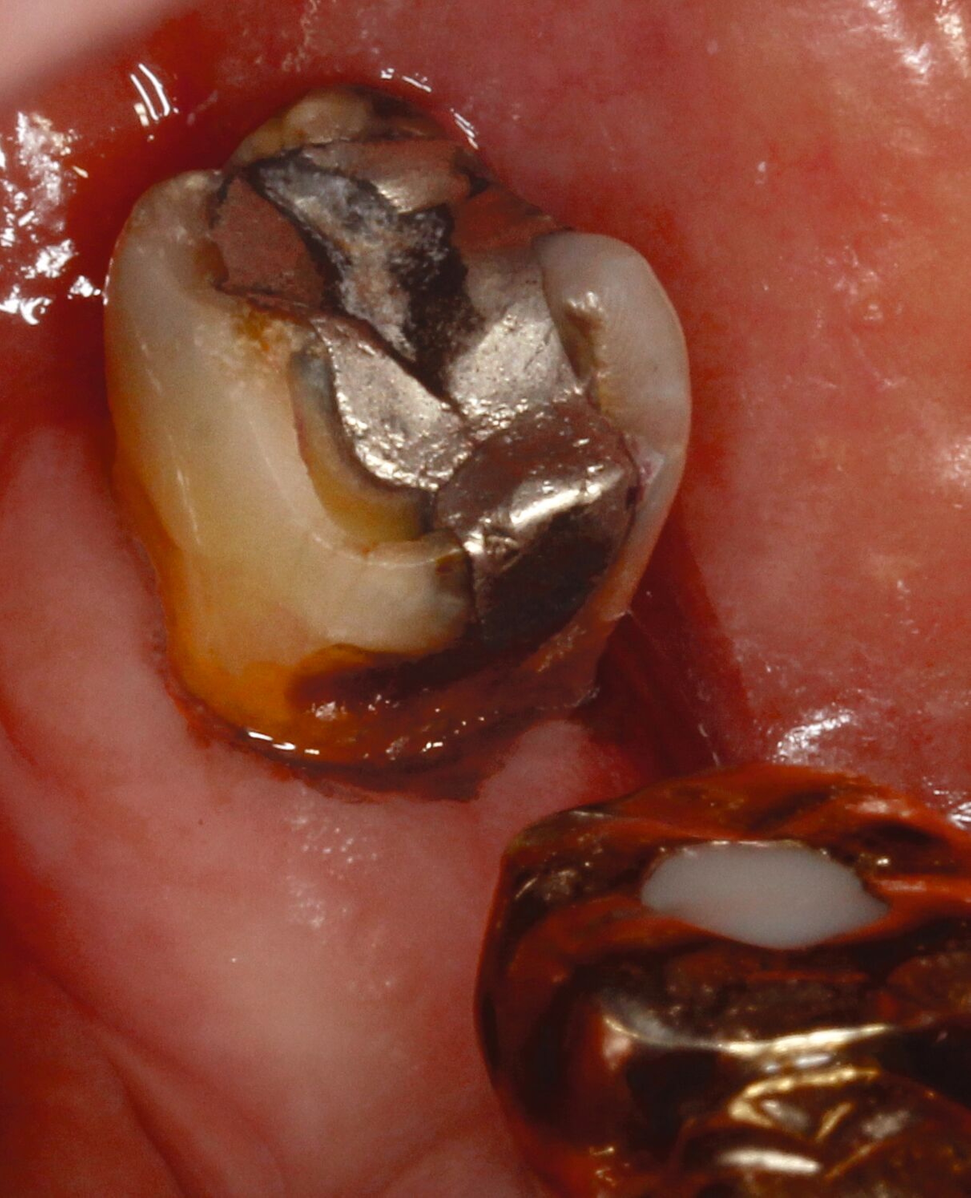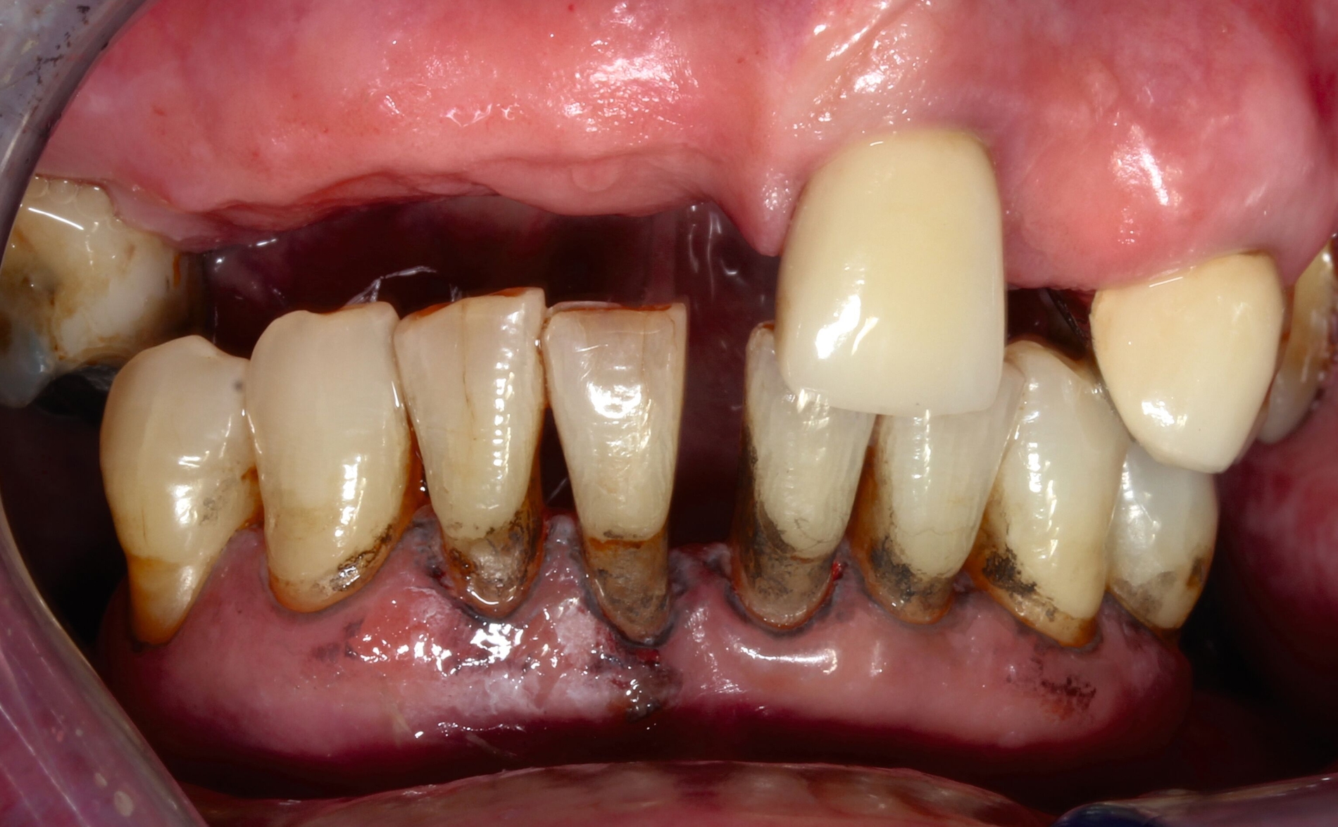 Eine bekannte Nebenwirkung bei Anwendung auf kariösen Läsionen ist die Schwarzfärbung des behandelten Bereichs (Abbildungen 3, 4). Verfärbungen können aber auch bei Applikation auf kariesfreien Wurzeloberflächen entstehen, diese sind jedoch mit einer professionellen Zahnreinigung gut zu entfernen (Abbildung 2).