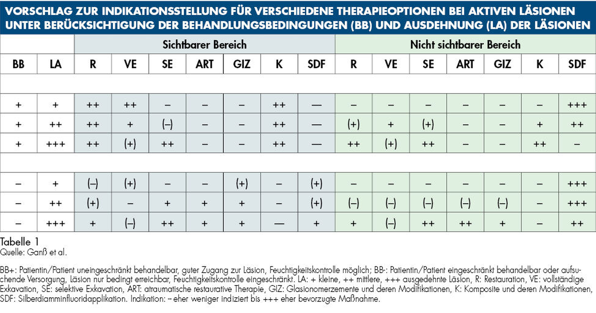 Die klinische Erfahrung zeigt, dass die restaurative Behandlung von Wurzelkaries oftmals mühsam, zeitraubend und nicht immer erfolgreich ist. SDF kann jedoch in vielen Fällen diese klinischen Herausforderungen lösen. In Tabelle 1 finden Sie einen Vorschlag zur Indikationsstellung der beschriebenen Verfahren.