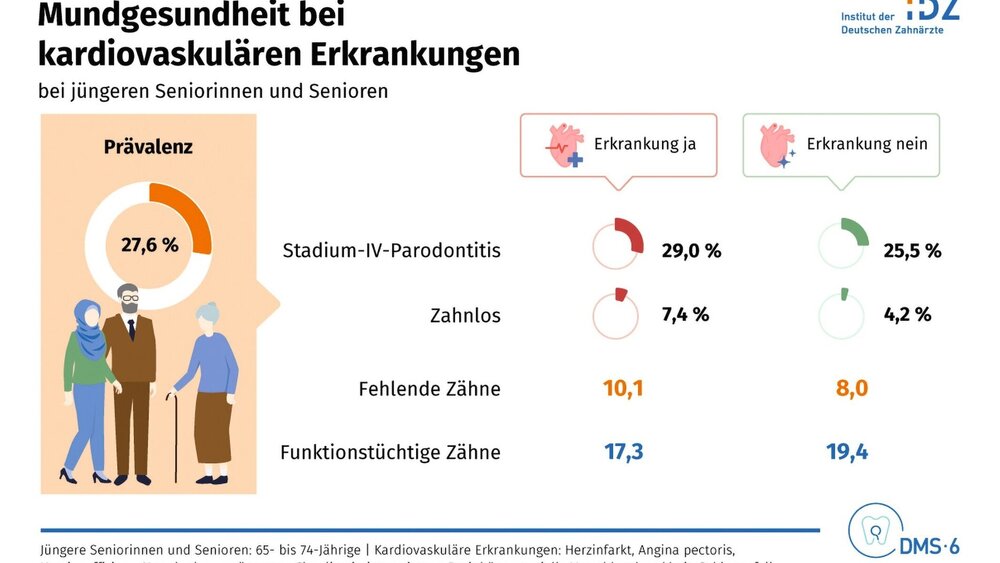 Jüngere Seniorinnen und Senioren mit Herz-Kreislauf-Erkrankungen hatten eine geringere durchschnittliche Anzahl an Zähnen (-2,1 Zähne) und waren häufiger zahnlos als Teilnehmende ohne Herz-Kreislauf-Erkrankungen (7,4 gegenüber 4,2 Prozent).