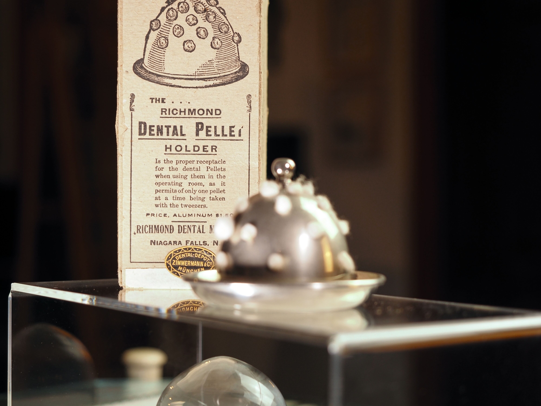 Welche museale Erkenntnis lässt sich mitnehmen? Es war wieder einmal ein Recherchefund online, der Haeslers Wissen vermehrte. Was genau er gesucht hat, weiß er gar nicht mehr, als er plötzlich diese Verpackung auf dem Bildschirm erklickte. Niagara Falls, USA, aha! Die Verbreitung war also nicht auf Europa beschränkt, sondern „der wurde auch in Übersee benutzt“. Nicht, dass jetzt die Geschichte der Zahnheilkunde neu geschrieben werden muss, aber: „Hier freut man sich und kombiniert!“