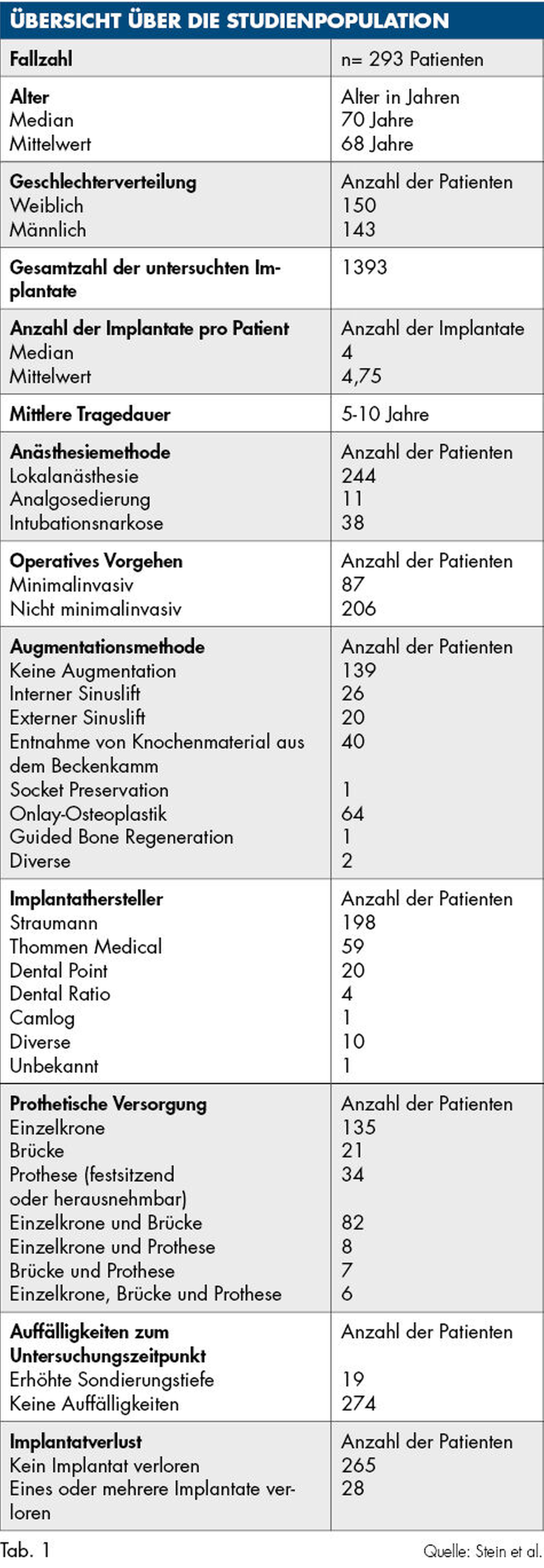 Die mittlere Verweildauer der Implantate betrug fünf bis zehn Jahre. Dabei wurde ein Großteil der Implantate in Lokalanästhesie (83,3 Prozent) und konventionell (70,3 Prozent) unter Bildung eines Mukoperiostlappens inseriert. In 44,4 Prozent der Fälle war keine Augmentation notwendig. Wenn eine Augmentation notwendig war, erfolgte diese am häufigsten in Form einer Onlay-Osteoplastik (21,8 Prozent). Ein Sinuslift (intern/extern) wurde in 8,9 Prozent der Fälle durchgeführt.