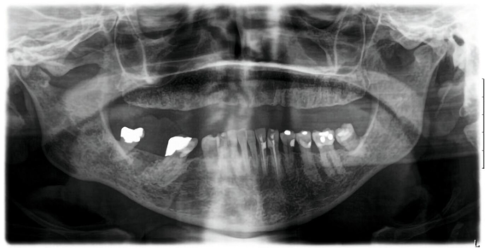 Klinisch waren zum Vorstellungszeitpunkt keine Beeinträchtigungen der Durchblutung, der Motorik oder der Sensibilität zu beobachten. Es zeigte sich eine weiche, nicht ulzerierte, schmerzlose Schwellung in Regio 46 bis 48 (Abbildung 1). Das OPTG ergab eine persistierende Extraktionsalveole, was zur Medikamenten-Anamnese (Z.n. Bisphosphonattherapie) passt (Abbildung 2).
